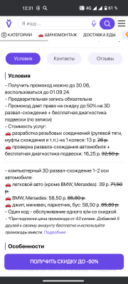 - Промокод дает право на скидку до 50% на 3D развал-схождение + бесплатная диагностика подвески (по записи)