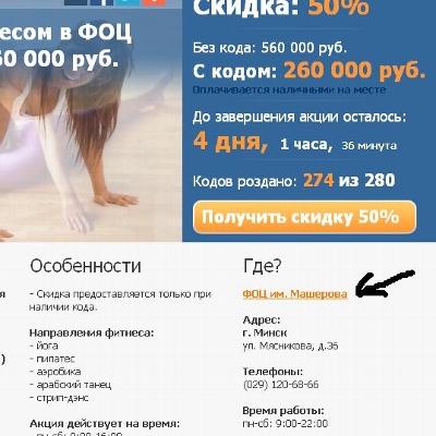 - Промокод дает право на скидку 60% на первое пробное посещение по фитнесу для новых клиентов в ФОЦ им. Машерова