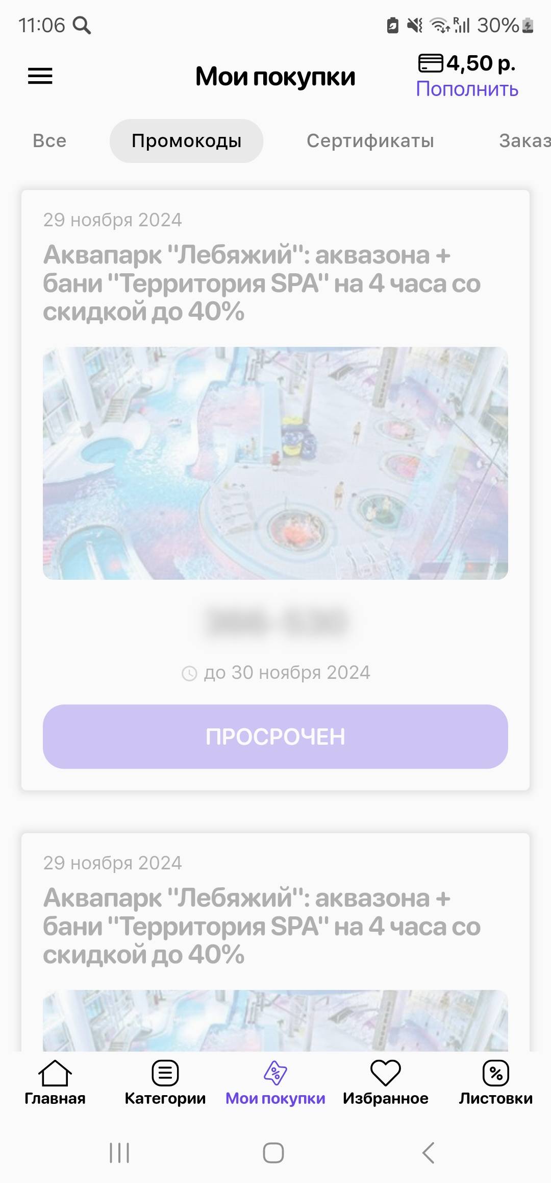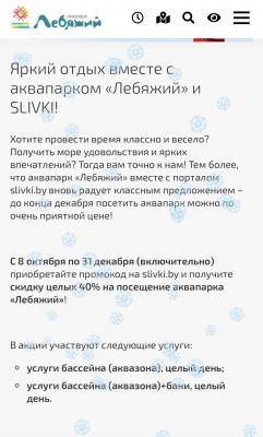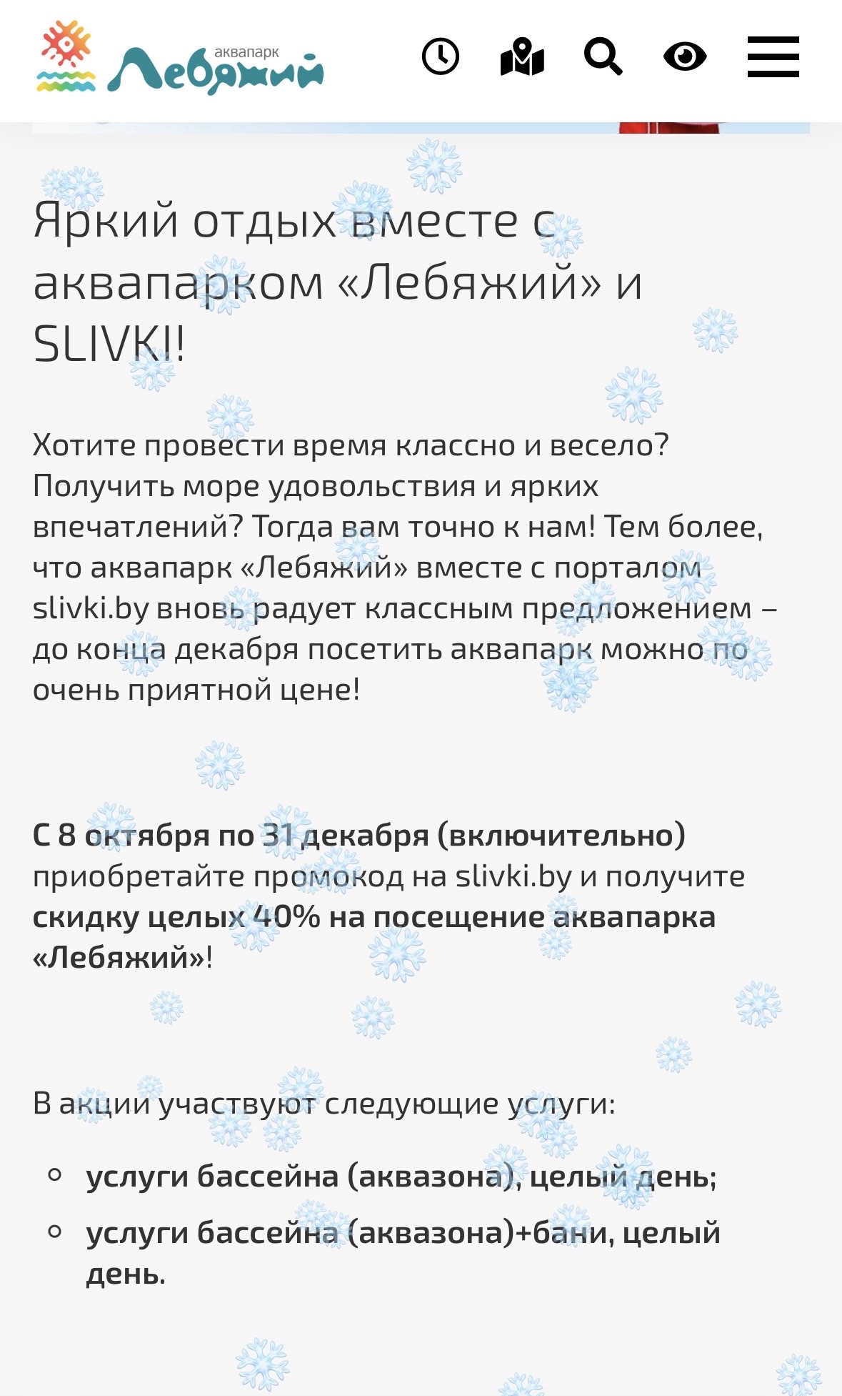 - Промокод дает право на скидку 35% на посещение аквапарка "Лебяжий"