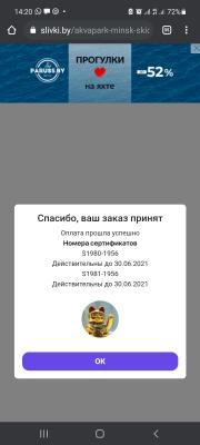 Здравствуйте, администрация сливок! 30.06.21 в 14.20, я оплатил два сертификата на посещение Фристайла. Во вложении скриншоты.Увидив, что акция действует до 30.06.21, то есть до завершения акции осталось несколько часов, я  позвонил во Фристайл, поинтересовался смогу ли я воспользоваться сертификатами в другой день. На что мне, ответила сотрудница Фристайла, ни смотря на то что сертификаты действуют до 30.06.21, воспользоваться ими можно в течении недели. Сегодня 02.07.21 придя во Фристаил, предъявив данные сертификаты- QR коды,  сотрудница на рицепшине сообщила, что по данным сертификатам, я и моя подруга пройти не сможем, так как закончился срок. Порекомендовала обратиться к Вам в slivki.by. Прошу продлить действие сертификатов, либо вернуть денежные средства за неиспользованные сертификаты. Заранее спасибо.
