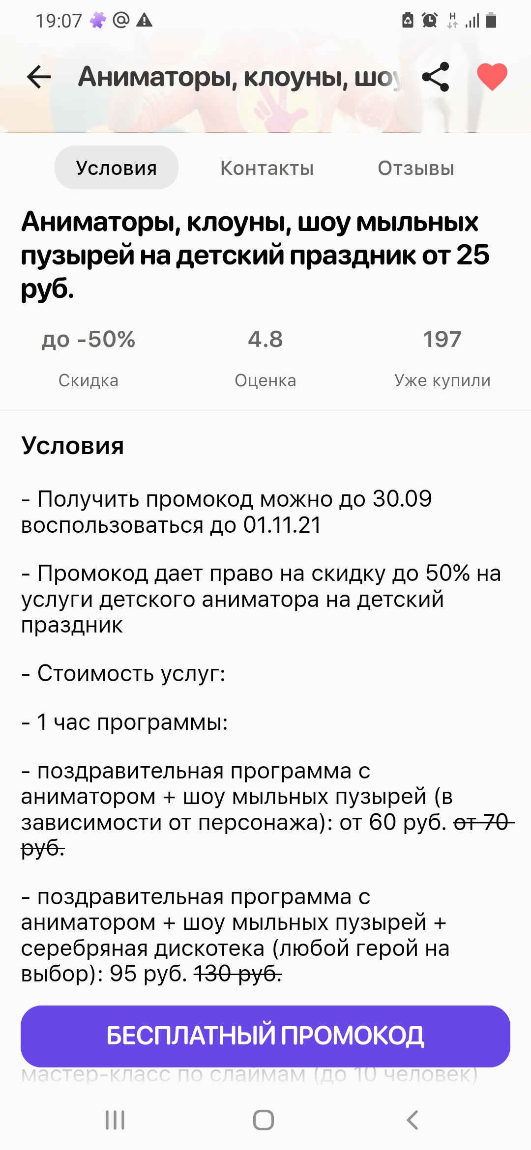 - Промокод дает право на скидку до 50% на услуги аниматоров, клоунов, шоу мыльных пузырей на детский праздник