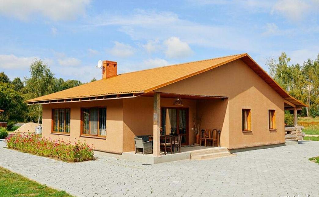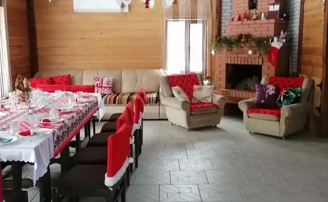 В большом просторном доме одновременно могут отдохнуть 30 человек. Внутри уютный красивый интерьер, выполненный из натуральных экологичных материалов. Для корпоративных мероприятий имеется банкетный зал. Приятно вас удивит и порадует необычная большая деревянная баня (таких бань ещё не видели!), а на улице всю эту красоту дополнит тёплая, а по желанию холодная купель.