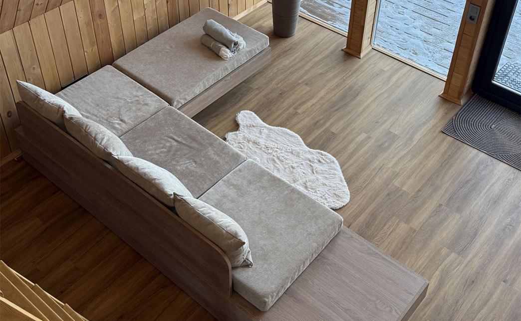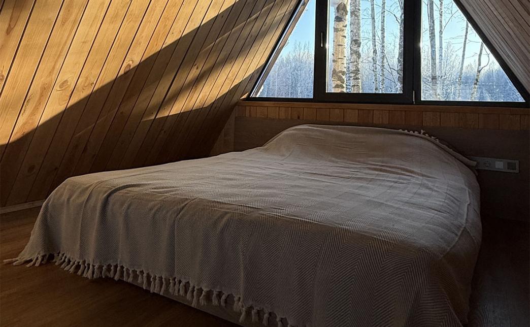 - Постельное белье, тапочки и панорамные окна с видом на природу