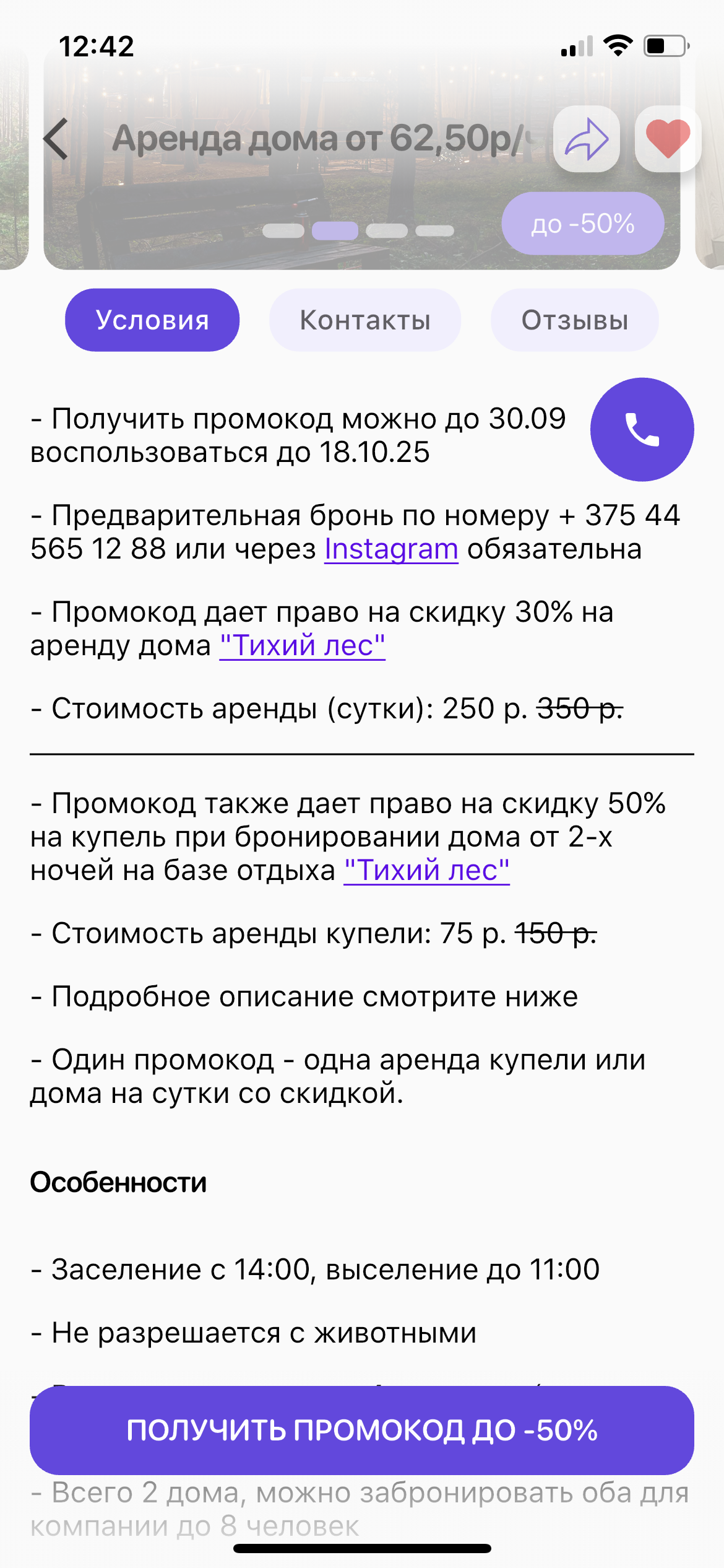 - Промокод дает право на скидку 30% на аренду дома "Тихий лес"