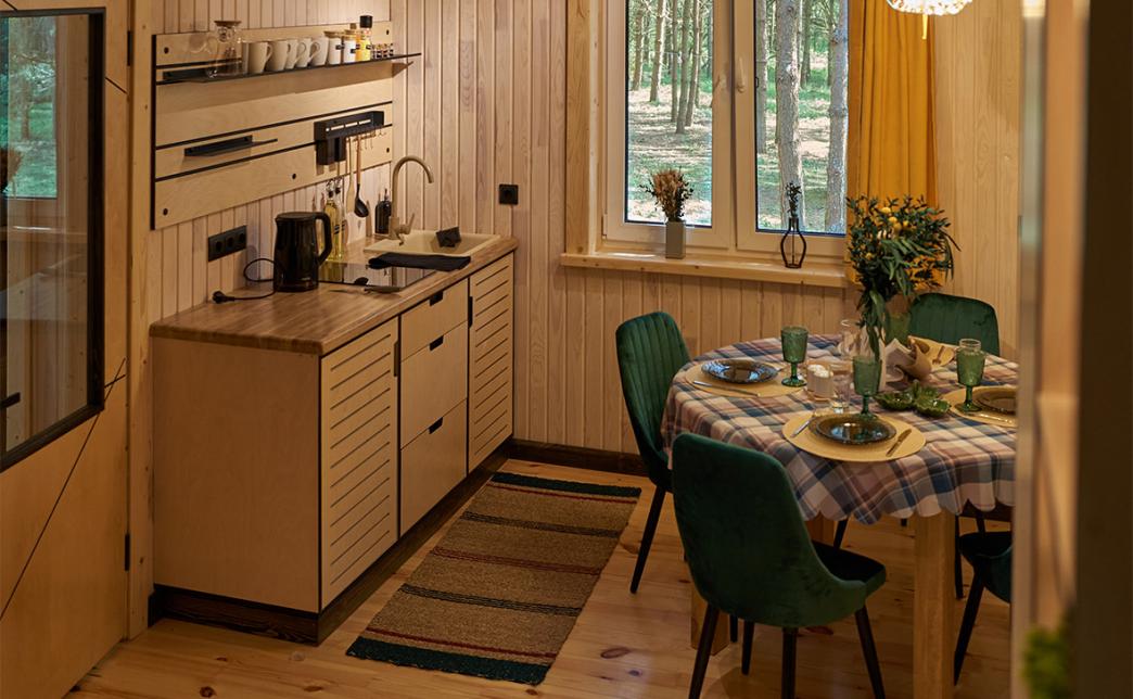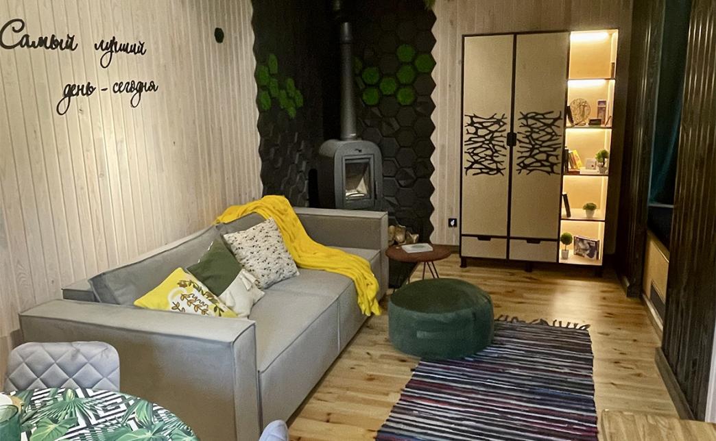 Внутри домика Вас ожидает настоящий домашний уют. Полностью оборудованная кухня с необходимой утварью, включая сковороду, кастрюлю, плиту, холодильник, чайник, а также кофе, чай, масло и специи. Ванная комната оснащена феном, полотенцами и всем необходимым для душа. Ночью Вы сможете наслаждаться панорамой леса прямо из уютной двуспальной кровати с ортопедическим матрасом, а для развлечения предоставлен проектор с экраном на 100 дюймов, настольные игры и книги. Понежьтесь у камина, наслаждаясь пламенем огня, или у костра под открытым небом. Если Вы хотите поработать в тишине, то для Вас обустроено рабочее место в одном из домов на втором этаже. Интернет Wi-Fi 100 Мбит/с оптоволоконный.