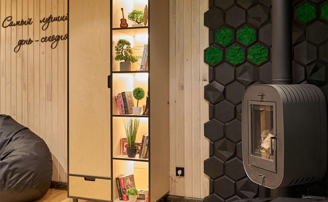 - огромный мягкий подиум-кровать с проектором и панорамным окном в лес
