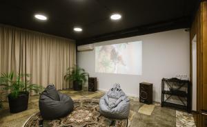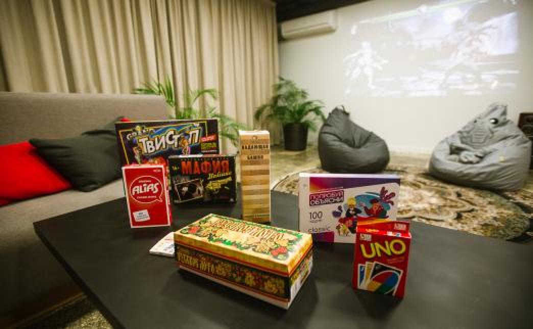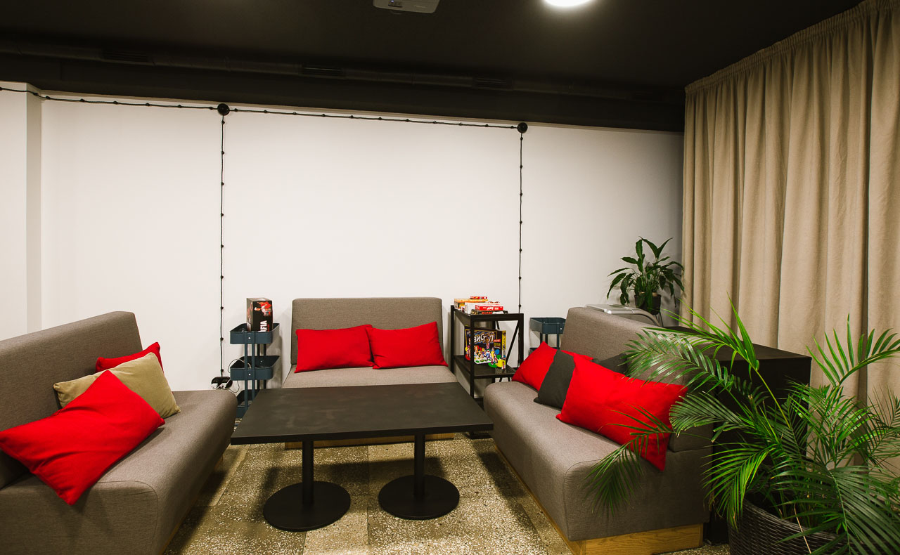 Уютная комната 60 квадратных метров вместимостью до 15 человек, оборудована прекрасным проектором, качественной акустической системой, удобными диванами и кресла-мешками. К нам вы можете заказать свою любимую доставку или принести еду и напитки с собой, мы предоставим посуду и приборы.
