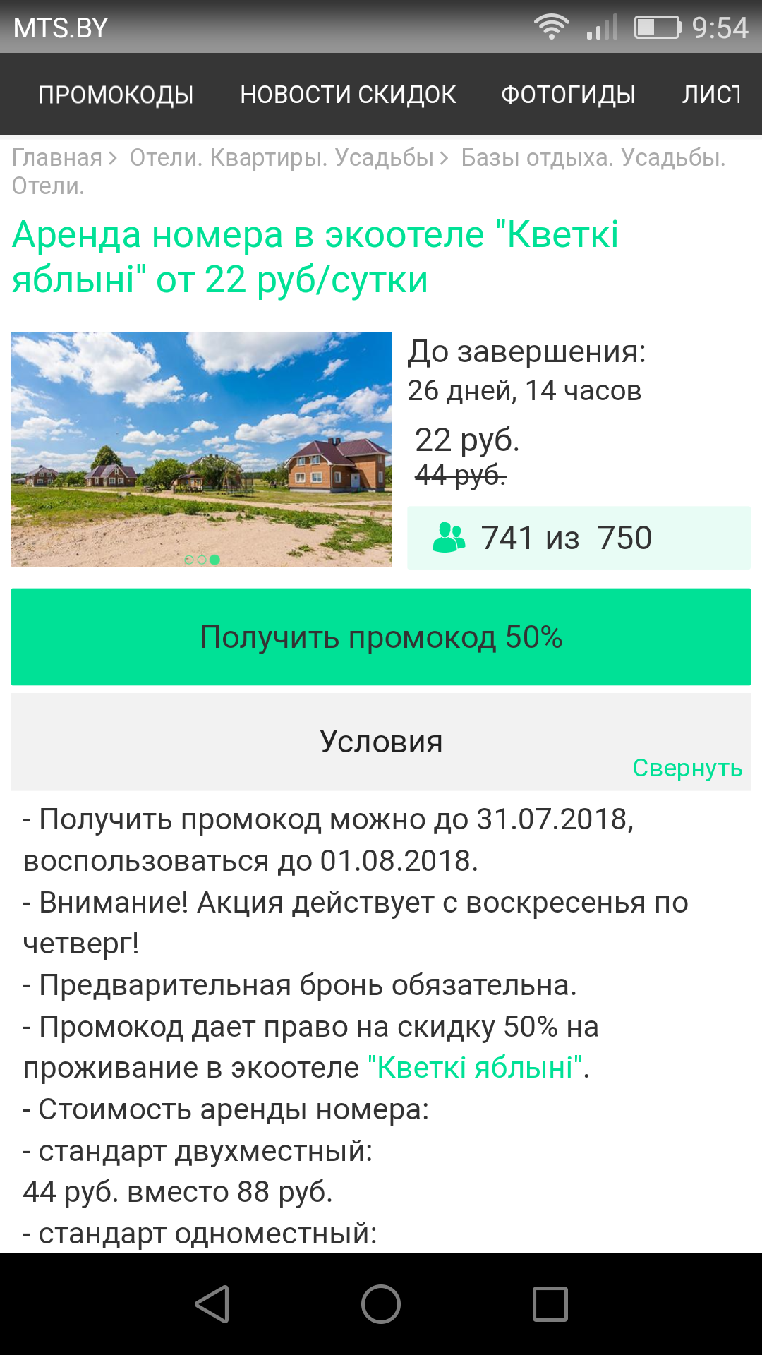 - Промокод также дает право на скидку 70% на проживание на вторые и последующие сутки в экоотеле "Кветкi Яблынi" при аренде первых суток по полной цене