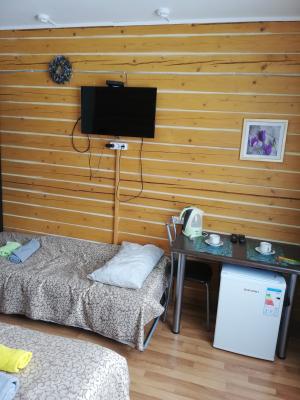 - Оснащение: холодильник, фен, чайник, чашки, полотенца, Wi-Fi, ТV, мыло, шампунь, гель для душа, тапочки