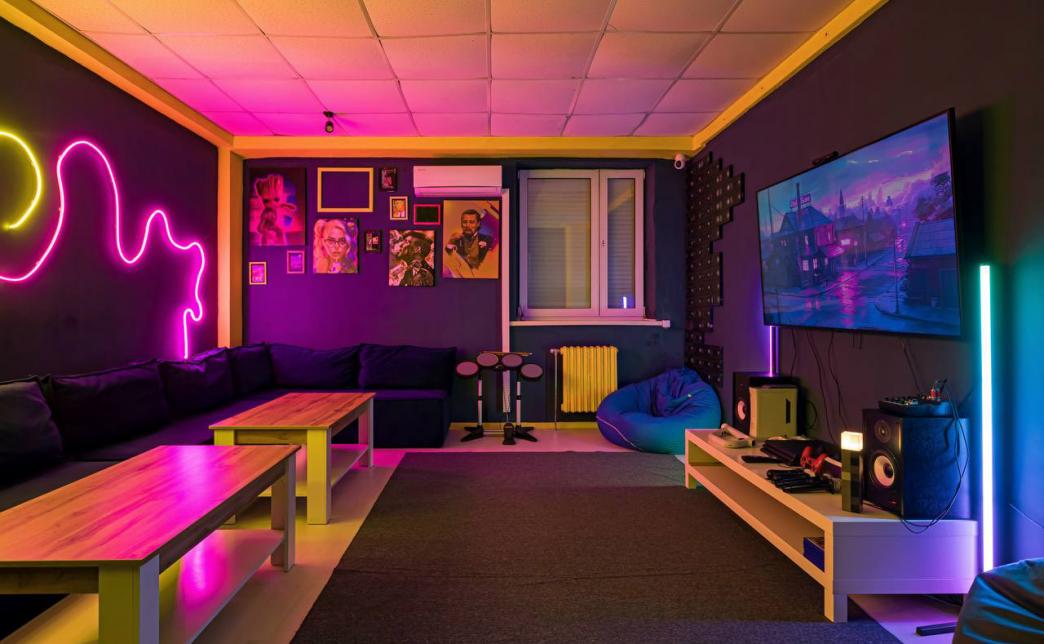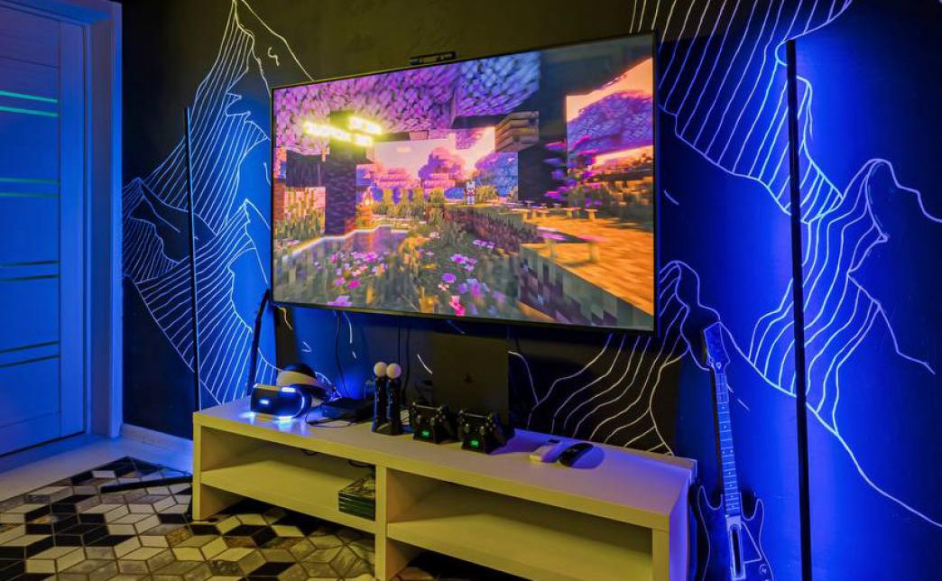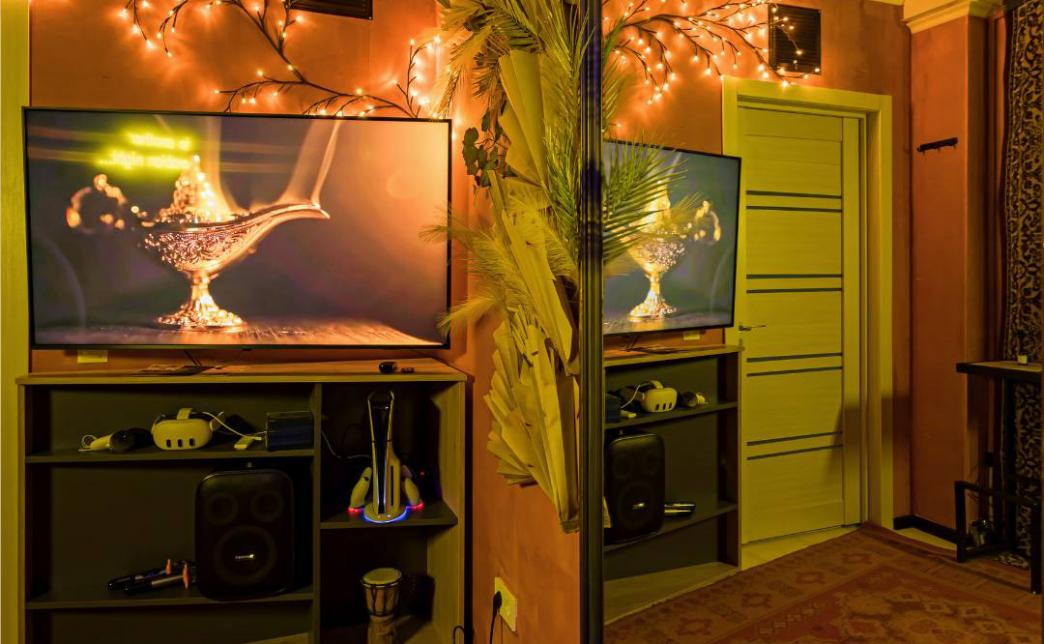 Комната оборудована телевизором "65’ TV 4K Ultra HD", караоке с 2 микрофонами, VR + Aim controller, "PlayStation" + "Xbox", "RockBand" (барабаны + гитара), "JustDance" с камерой захвата движения, настолки, кольцевой лампой для фотосессий и кондиционером.