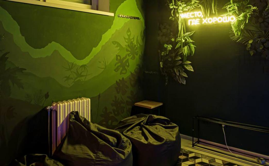 Вся комната - сплошная фотозона: грамотное зонирование мебели, вручную расписанные художником стены, ламповое освещение и та самая стена, которая расскажет всем, где Вы находились - в месте, где хорошо!