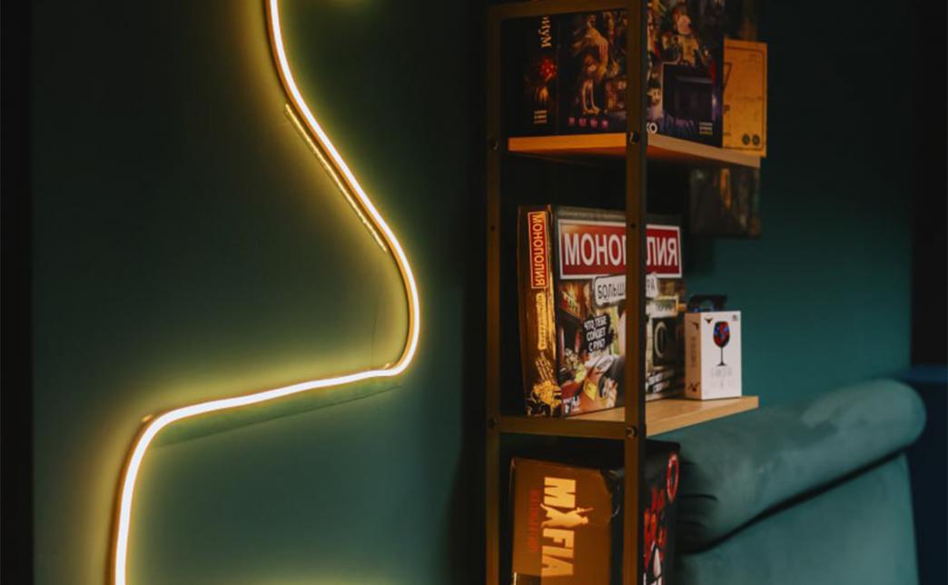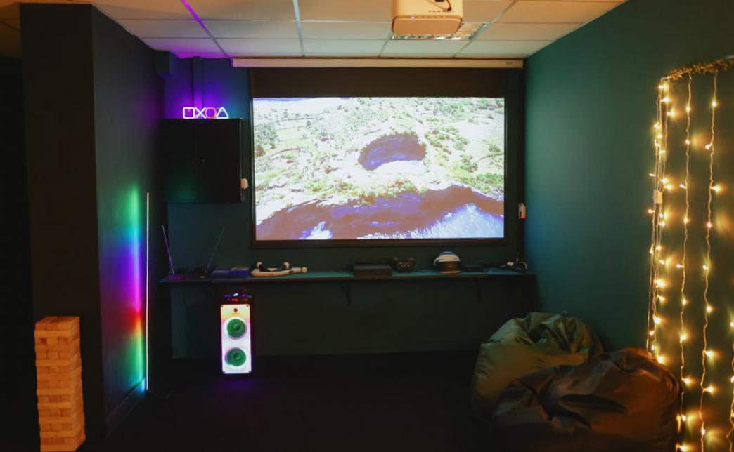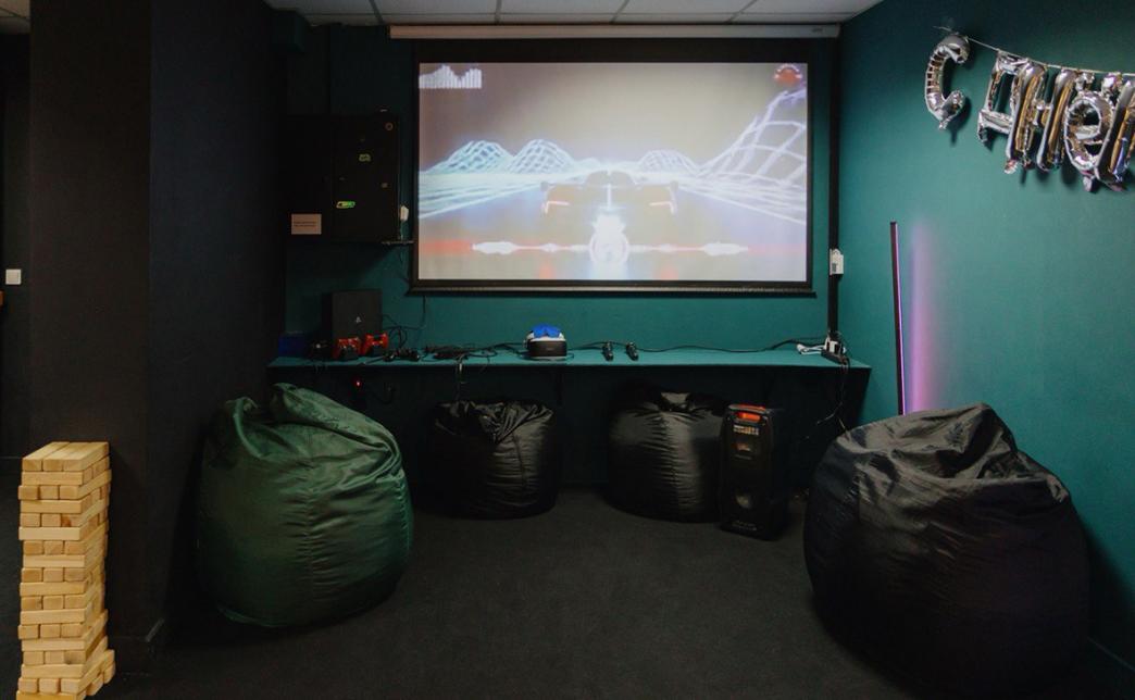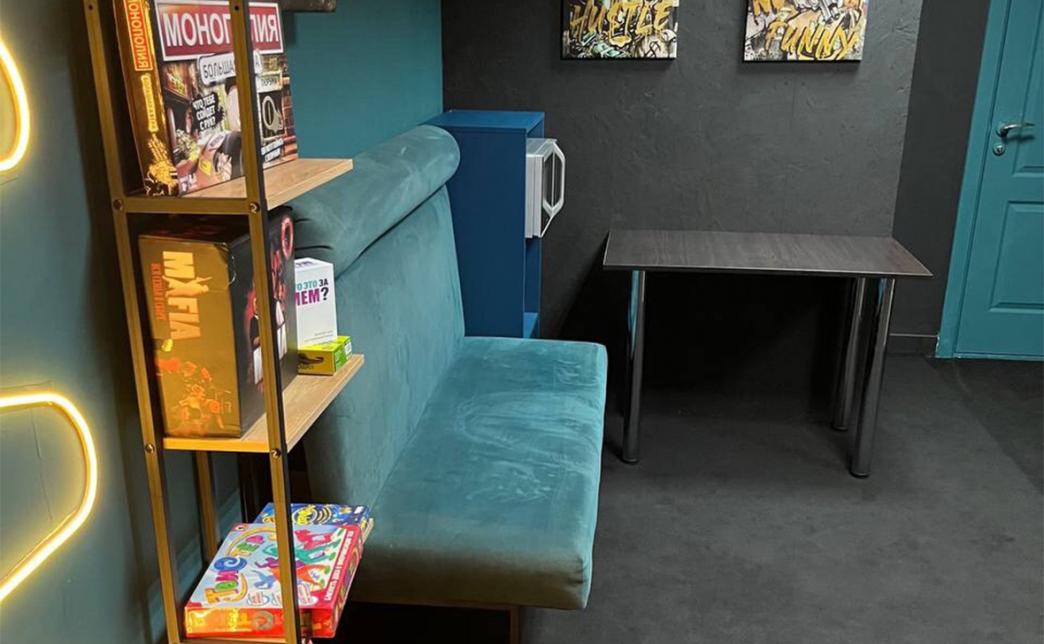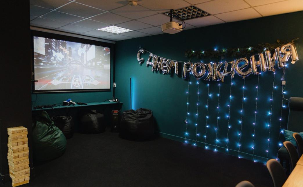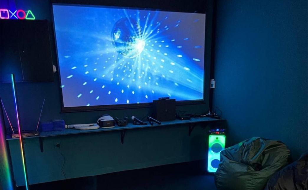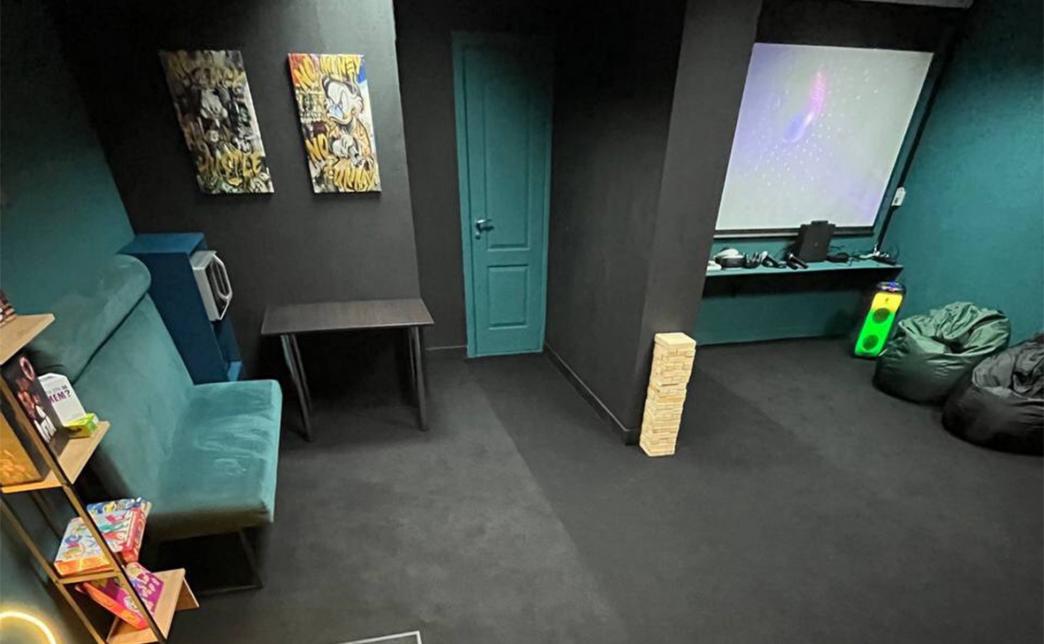 В комнате можно спеть караоке, так же есть проектор и огромный экран 100 дюймов на котором можно включить "Just Dance" и круто потанцевать, собрать гигантскую дженгу, посмотреть фильм в хорошем качестве, поиграть в популярные игры на PS4 Pro, погрузиться в виртуальную реальность. Широкий список настольных игр, (по договоренности имеется возможность получить конкретную игру под ваш вечер). Удобные стулья и кресла-мешки позволят каждому гостю комфортно разместиться.