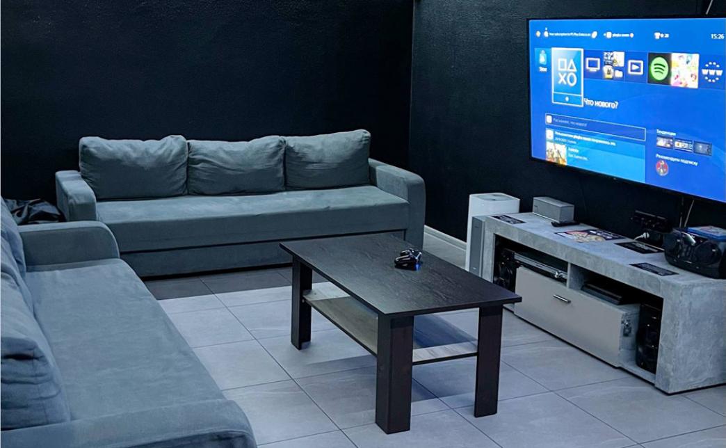 - серая комната вмещает до 12 человек: с двумя диванами, большим телевизором на 60 дюймов, "PS4", мощной аудиосистемой, которая подключается к телефону по блютузу, домашний кинотеатром, который выводит звук с телевизора и караоке