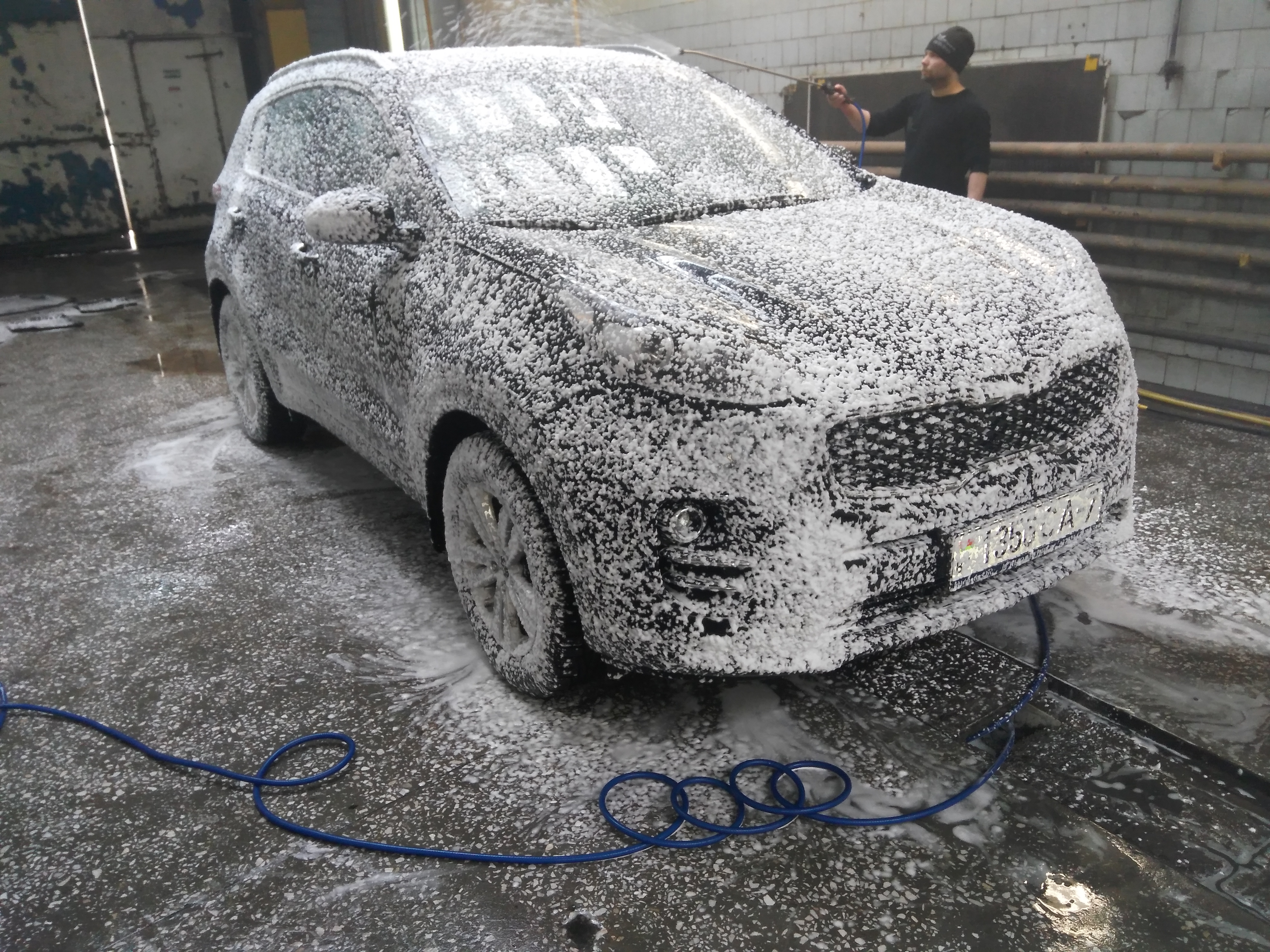 используется пеногенератор и шампунь для автомобиля, которым покрывается вся поверхность, позволяя справиться с видимыми загрязнениями.