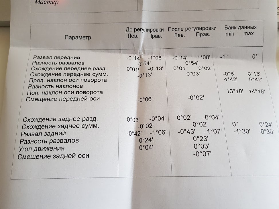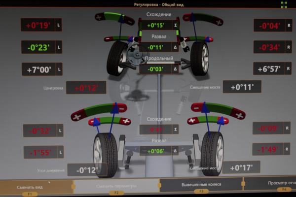 - регулировка схождения и развала передней оси + схождения и развала задней оси: