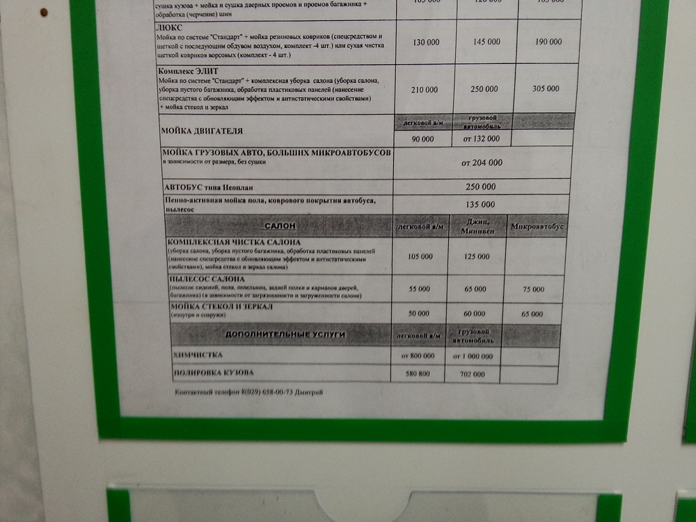 Стандарт: бесконтактная мойка (обмыв кузова, бесконтактная мойка, нанесение воска, сушка кузова + мойка и сушка дверных проемов и проемов багажника + обработка (черчение) шин