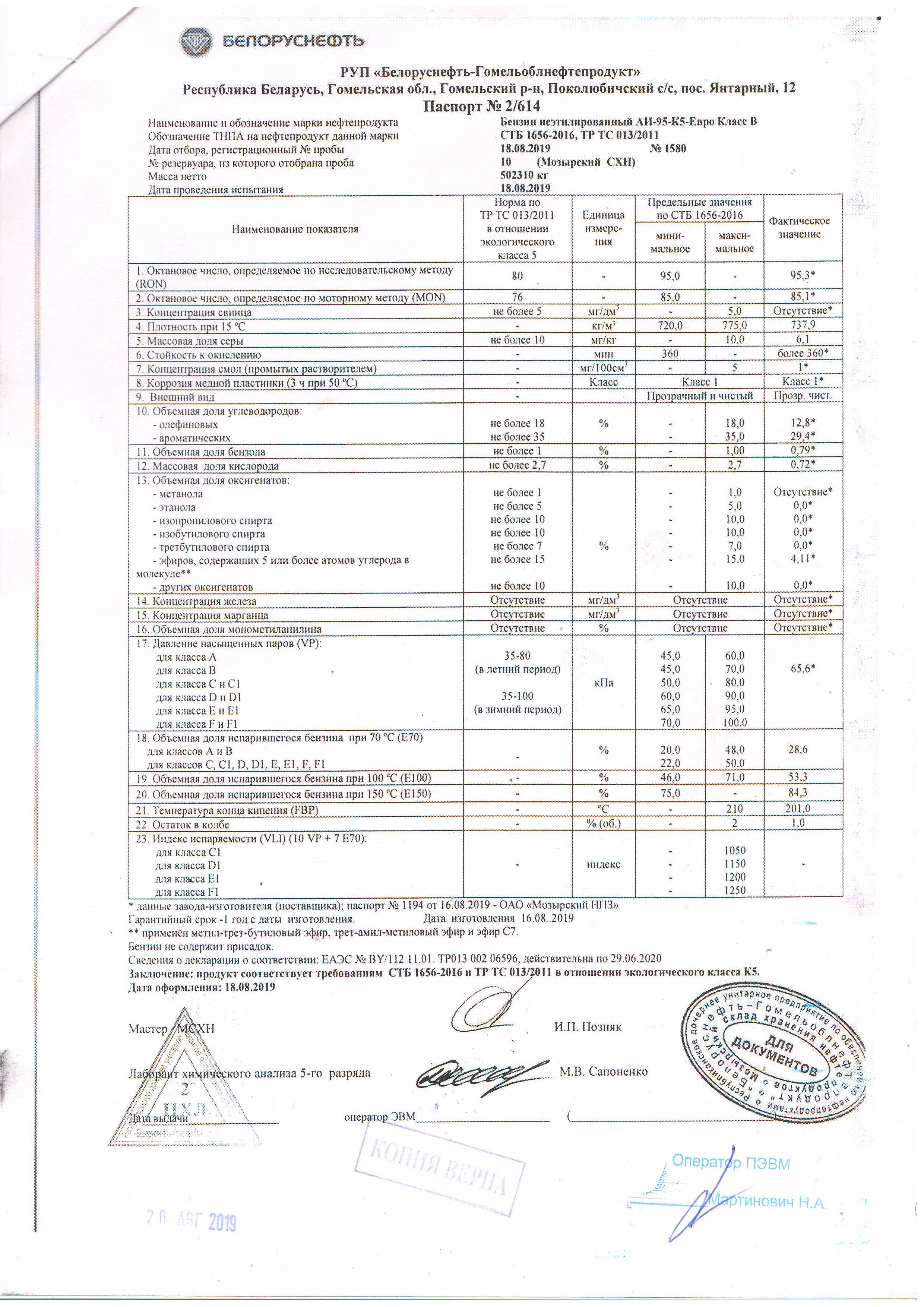 На АЗС «ТРАЙПЛ» реализуется топливо только производства ОАО «Мозырский НПЗ», соответствующее стандартам РБ и требованиям технического регламента Таможенного союза ТР ТС 013/2011 «О требованиях к автомобильному и авиационному бензину, дизельному топливу». Соответствующие пробы нефтепродуктов, которые отбираются при каждой поставке топлива, находятся на всех наших АЗС. Подвоз нефтепродуктов на АЗС производится непосредственно с ОАО «Мозырского НПЗ». Бензин неэтилированный АИ-95-К5-Евро паспорт № 2/614 был доставлен на АЗС-1 21.08.2019 г.