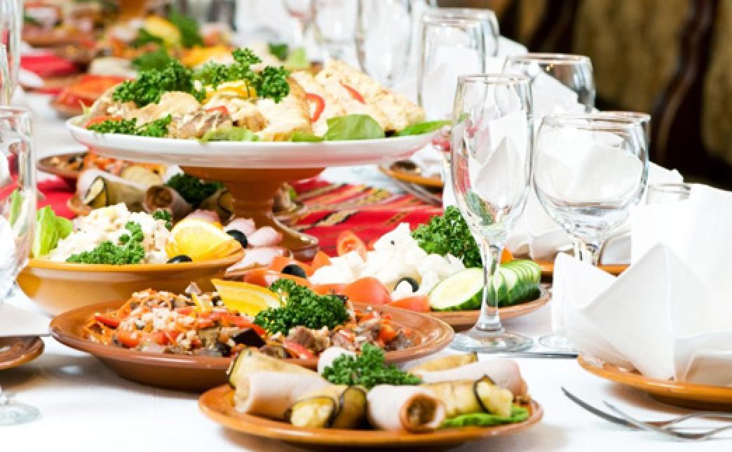 - Свадьба: 12 холодных закусок, 1 горячая закуска, 1 порционный салат, 3 общих салата, 5 горячих и 3 гарнира на выбор (порционно), 1 горячее порционно (ассорти из 4-х блюд).