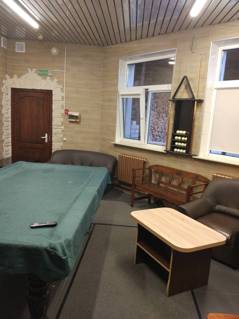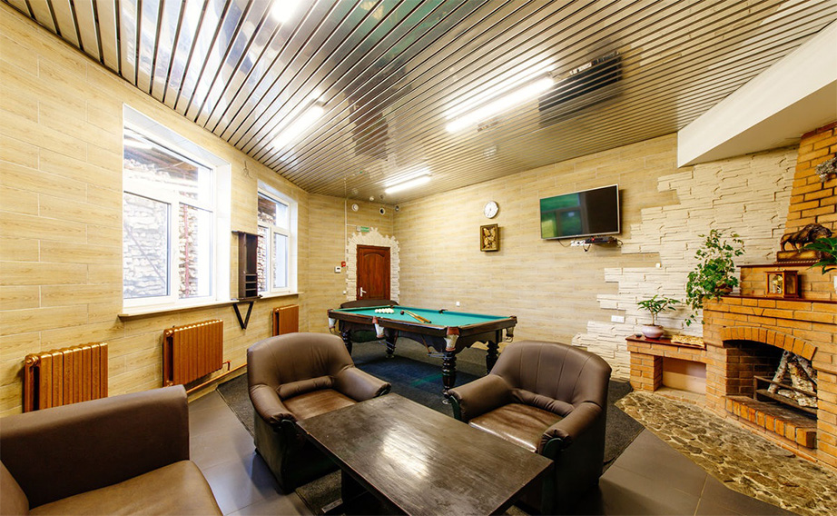 Также Вас порадует и просторная комната отдыха, где Вы сможете сыграть в русский бильярд или выпить чашечку ароматного кофе, отдыхая на удобном кожаном диване у камина.