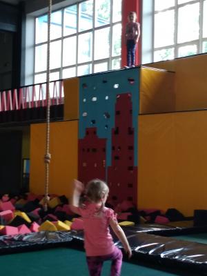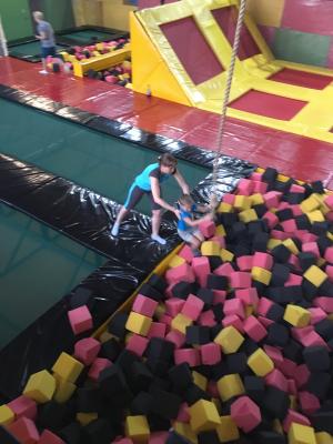 Впервые попробовали, что такое скакать на батутах. Чудесно, спасибо инструктору Наташе: показывала, объясняла, была рядом и не спускала глаз с детей (они там скачут, как кузнечики).