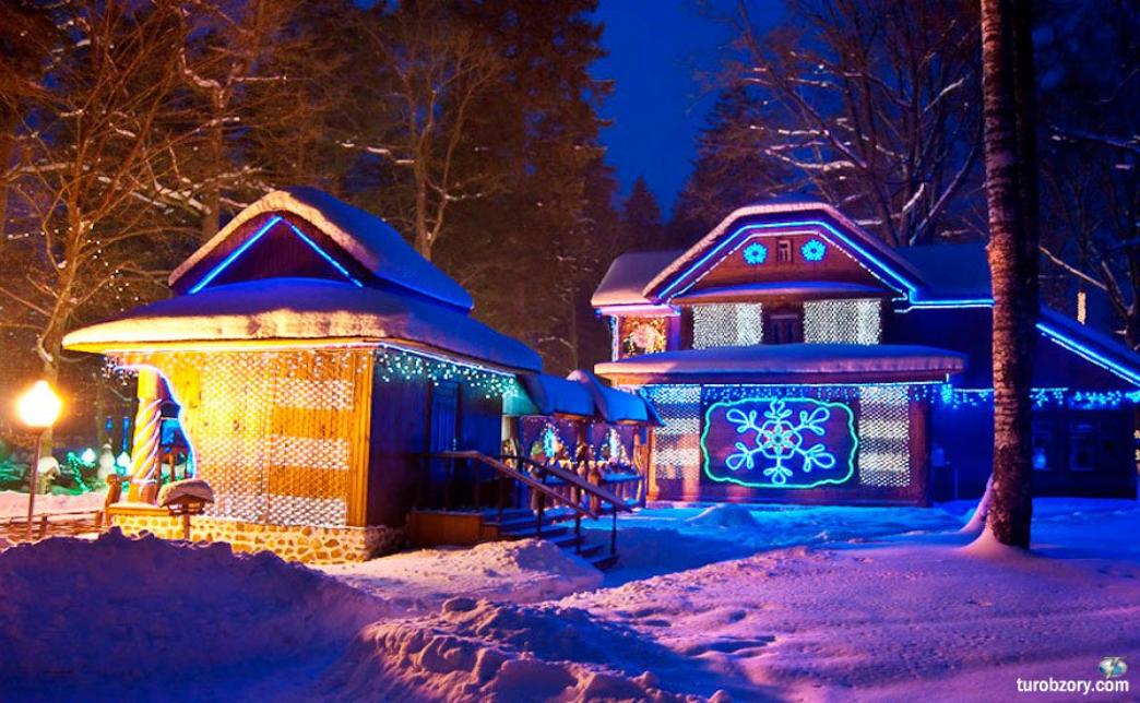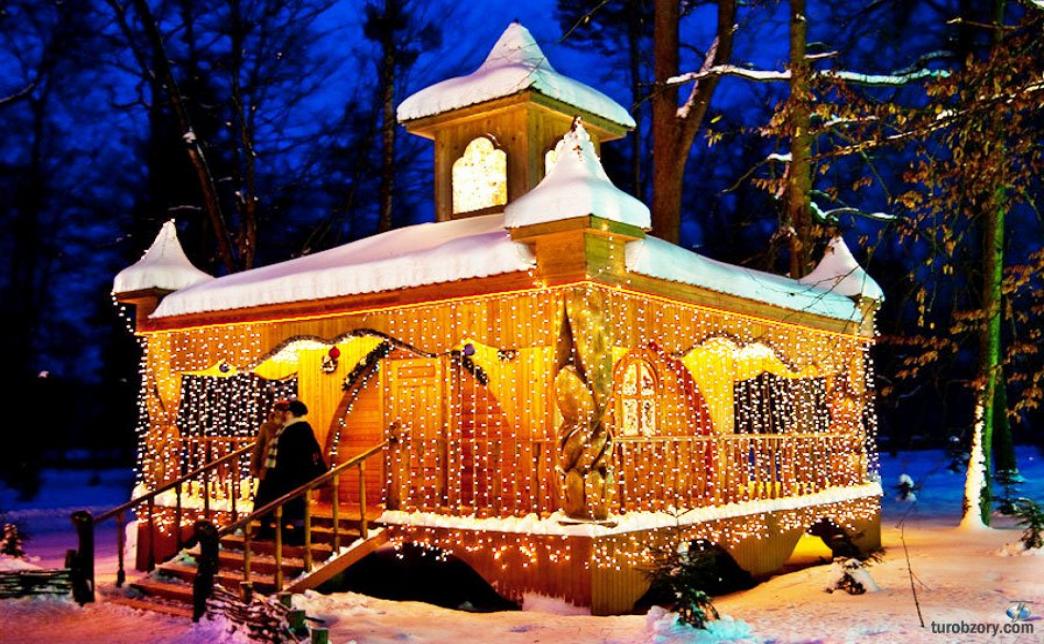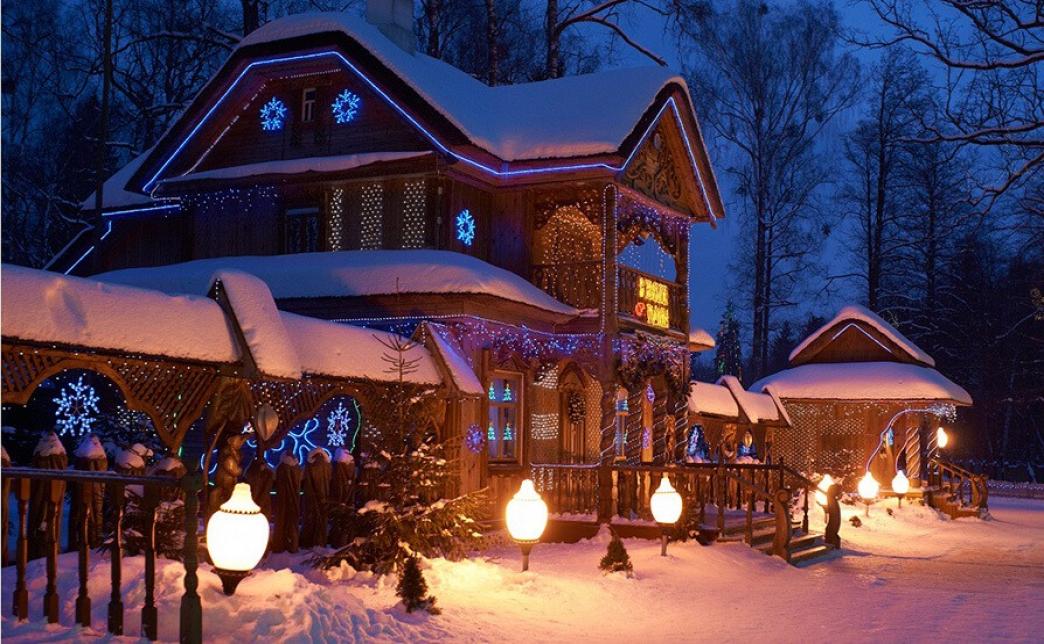 - скульптурные композиции из дерева 12 месяцев, Белоснежка и семь гномов и многое другое. На территории резиденции самая высокая в Европе сорокаметровая 120-летняя натуральная ель в своем новогоднем убранстве. Возле этой ели Вас встретит Матушка-Зима и закружит в новогоднем хороводе.