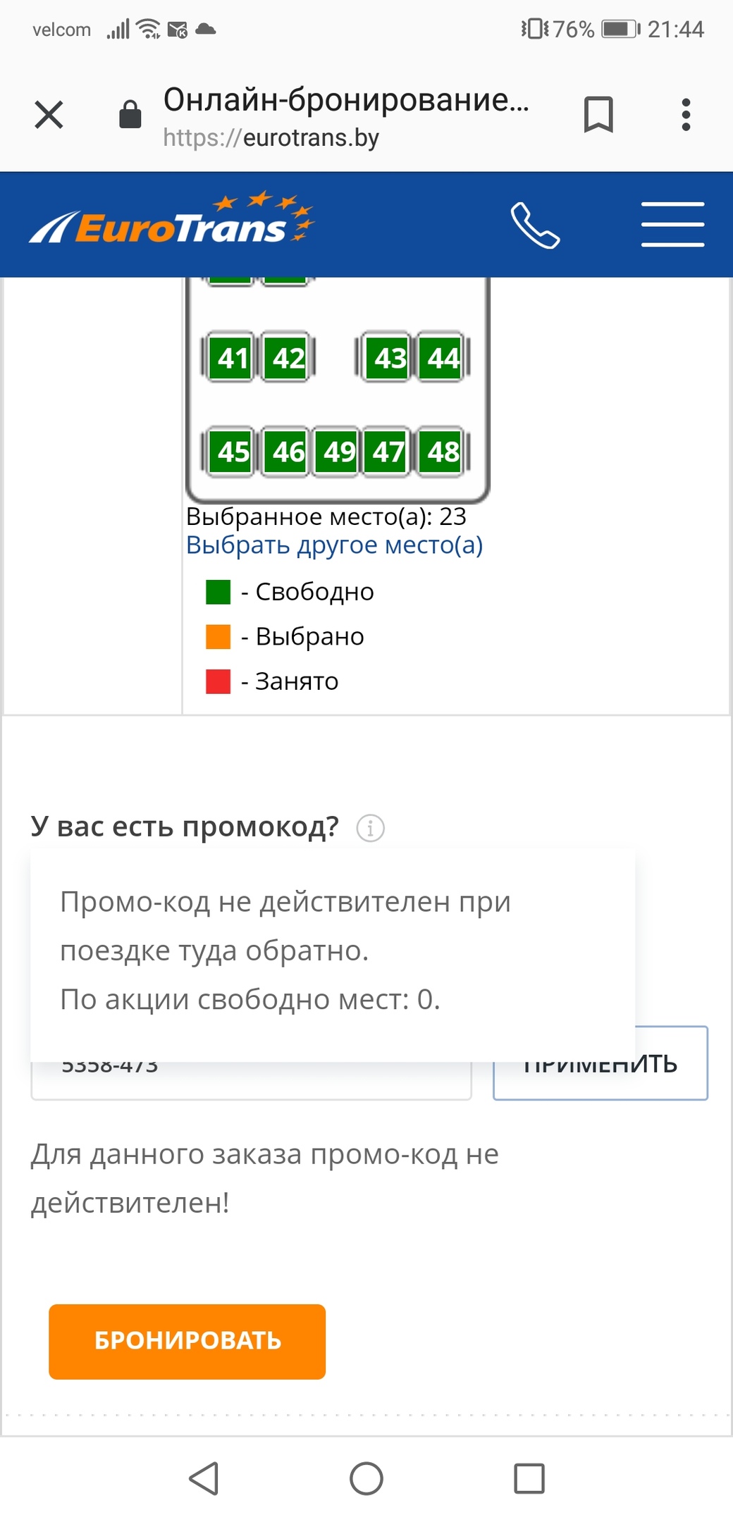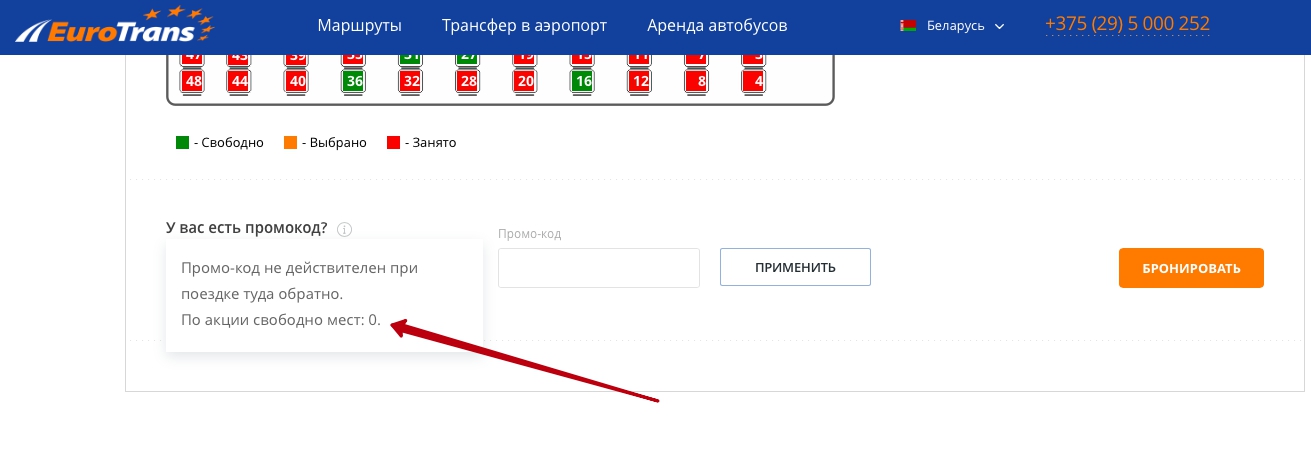- Перед покупкой промокода проверьте наличие свободных акционных мест на сайте eurotrans.by (инструкция под описанием)