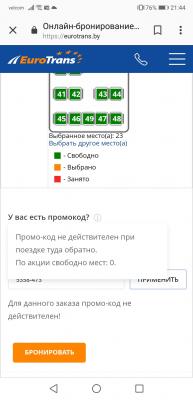 Здравствуйте. Купили 4 промо-кода, при попытке ввести его на покупку билетов до Санкт-Петербурга на сайте uerotrans.by высвечивается это окно и надпись, что промо-код не действителен.