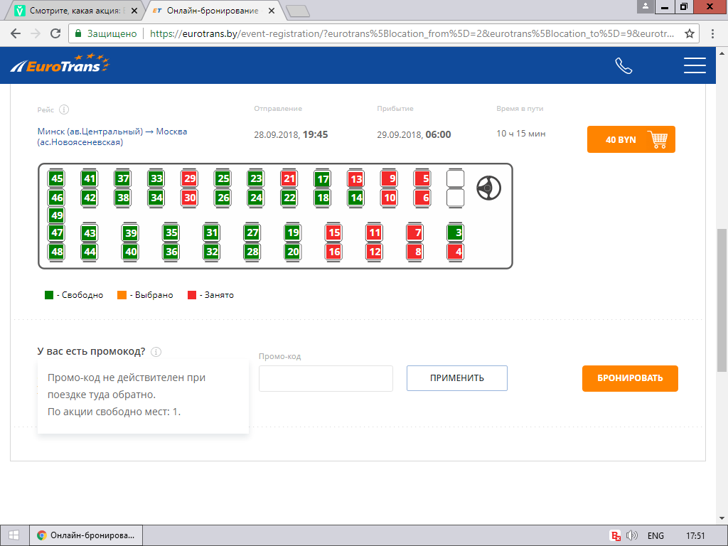 - Перед покупкой промокода проверьте наличие свободных акционных мест на сайте eurotrans.by (инструкция под описанием)