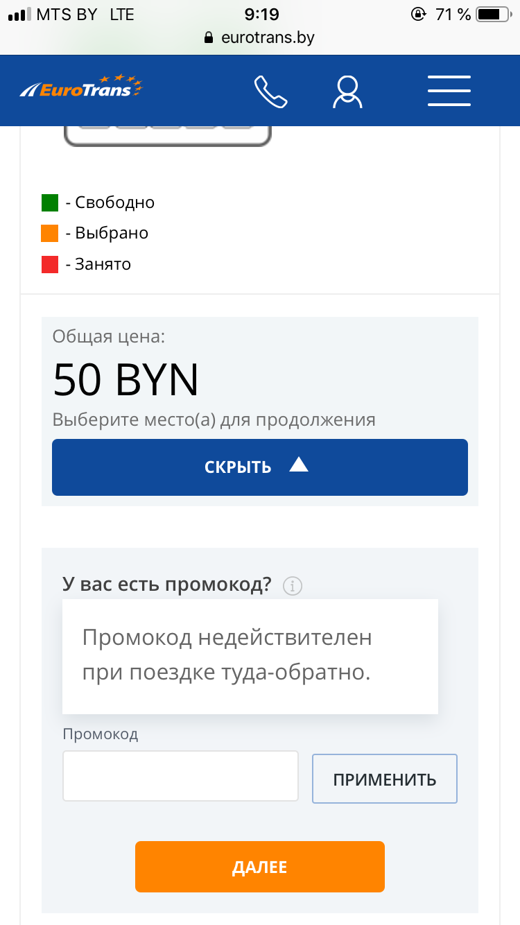 - Услуга бронирования билетов (оплата при посадке) по промокоду не предоставляется, предоставляется только покупка билетов на сайте eurotrans.by