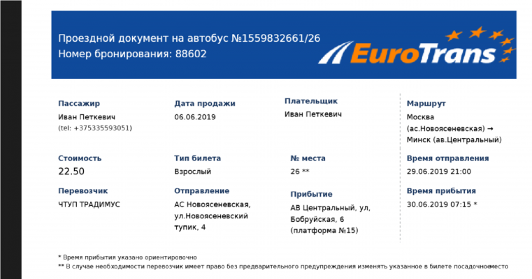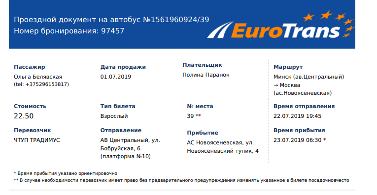 - Услуга бронирования билетов (оплата при посадке) по промокоду не предоставляется, предоставляется только покупка билетов на сайте eurotrans.by