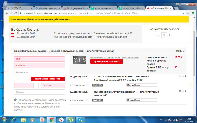 Добрый день. Только что приобрела два кода для направления рига-минск на двух человек. ввела коды до поиска, цена осталась та же. На 01.12.17