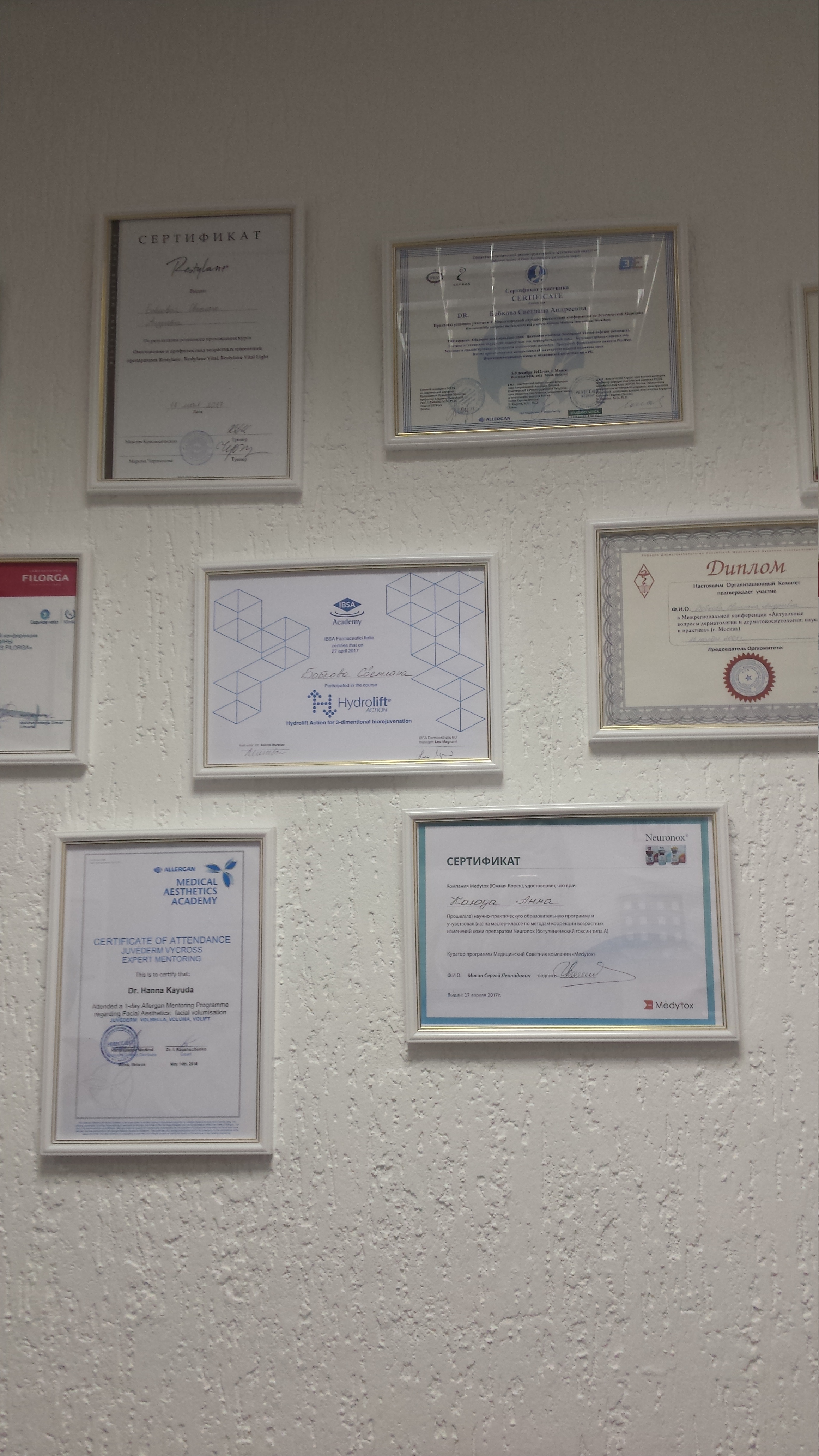 Здравствуйте, сегодня была на процедуре - уколы Диспорта у Каюды А.В..Впечатления от центра приятные, спокойная уютная обстановка, вежливые сотрудники и высокий уровень профессионализма врача-косметолога. Выполнили процедуру и я как ни в чем не бывало пошла заниматься дальше своими делами, в голове зреет план на какие процедуры к Вам попасть еще.Доктор сама очень привлекательная, хочется ровняться) спасибо Вам! Успехов Вам в Вашем труде и только довольных пациентов!