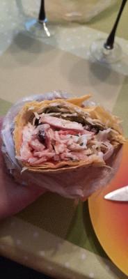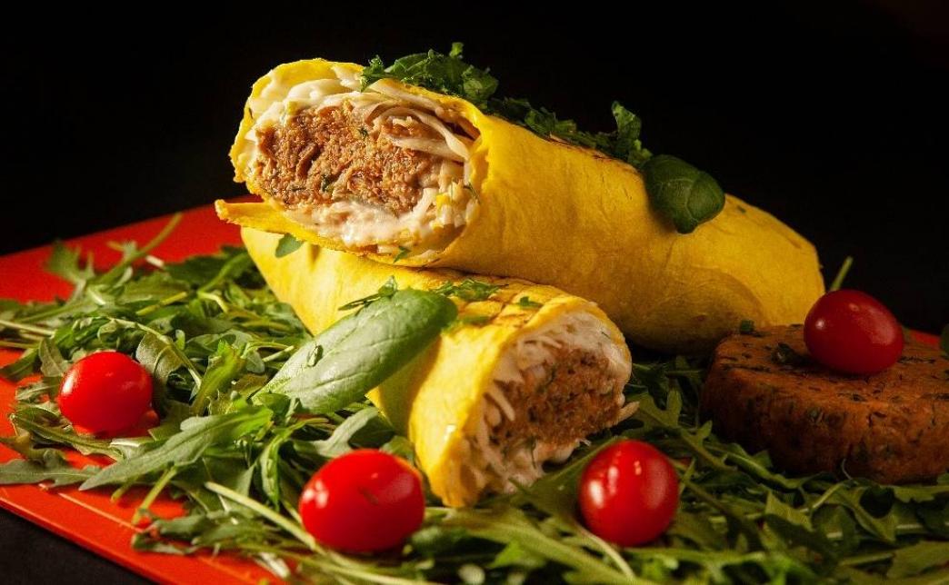 Состав: кефта из чечевицы (рис булгур, чечевица красная, красный лук, зелень микс, перечная паста), салат айсберг, соус чесночно-сливочный, кетчуп, томат свежий, огурец свежий, лук маринованный.