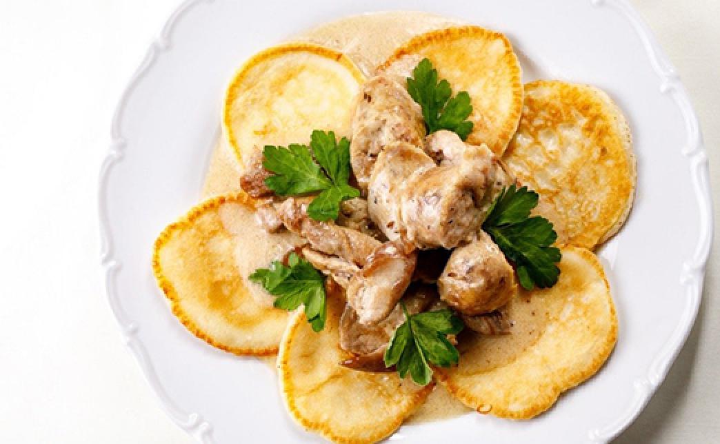 Состав: вырезка свиная, масло растит, соус грибной со сметаной, колбаска по-домашнему, драники, зелень