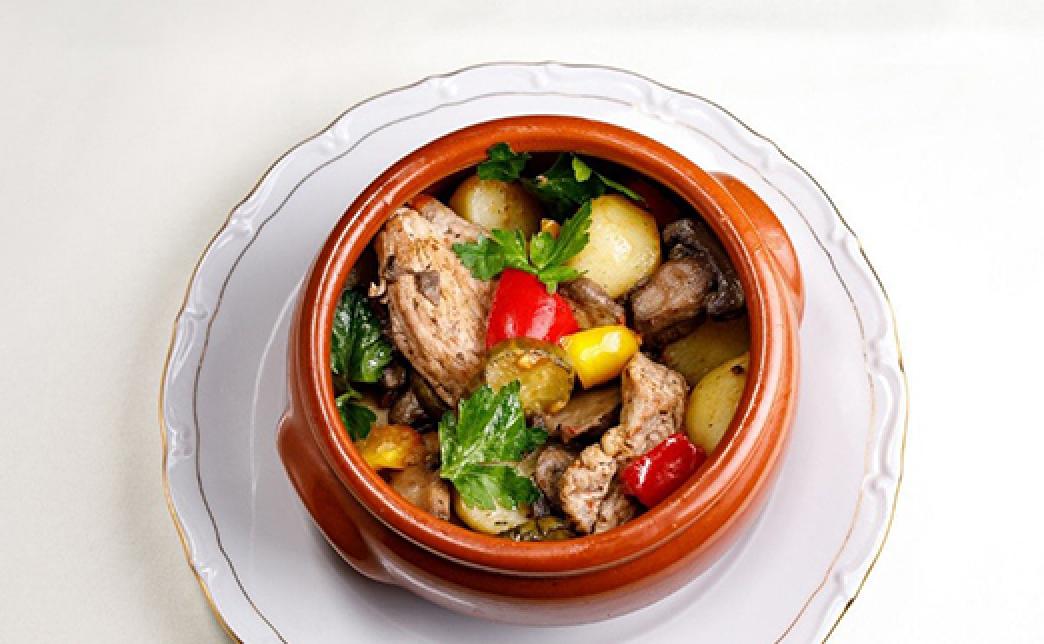 Состав: вырезка свиная, масло растительное, картофель, грибы белые, сыр, огурцы консервированные, чеснок, помидоры, перец, соль, специи, зелень, соус грибной