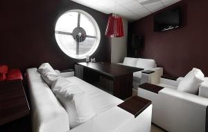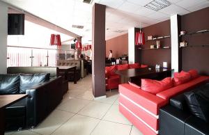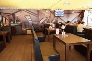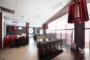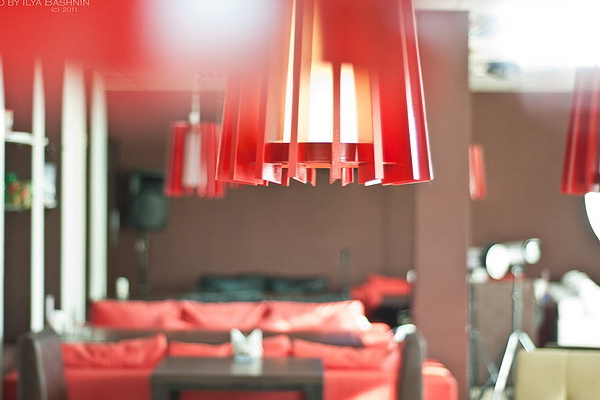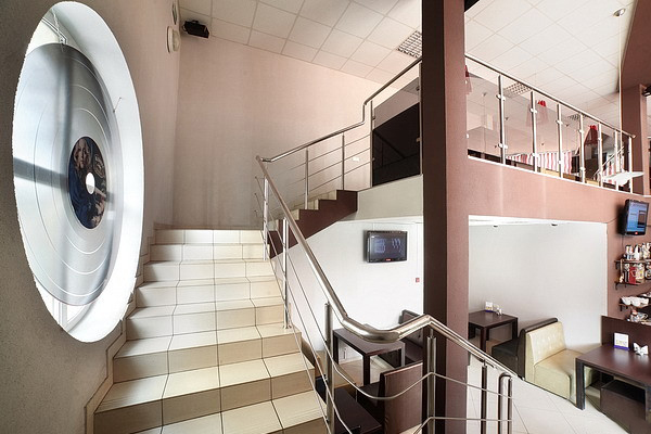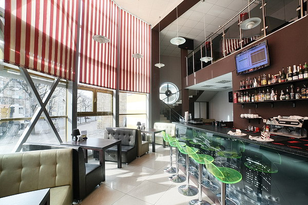 "День и Ночь" - не просто название. А, скорее, концепция, особенно прослеживающаяся в интерьере заведения. Посуда - белая и черная, диваны - также контрастных цветов, но в уже более теплой гамме - бежевой и коричневой. О них стоит сказать отдельно: в кафе вы не найдете ни одного неудобного стула - только мягкие кресла и уютные диванчики. Особенная приятность и уют царят на втором этаже - здесь над каждым столиком висят красные абажуры, создавая романтическую обстановку. А еще отсюда открывается хороший обзор, ведь стена кафе от пола до потолка представляет собой окна. По всему периметру стены щедро снабжены экранами (всего их 6), что обещает сделать «День и Ночь» излюбленным местом болельщиков, да и просто любителей вкусно поесть.