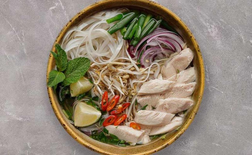 Состав: суп с курицей, рисовой лапшой, ростками бобов, лаймом и зеленью.