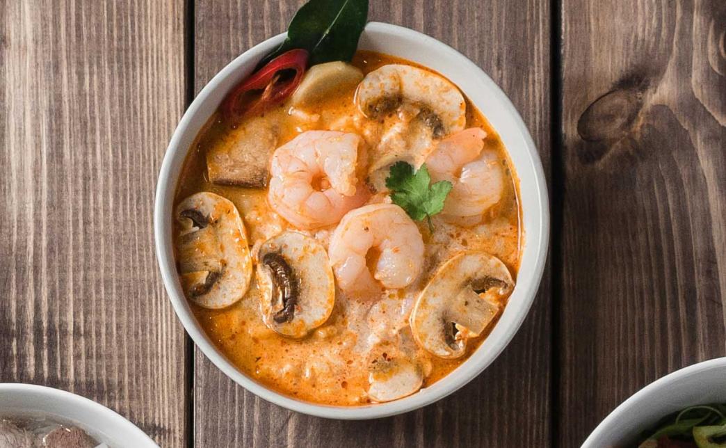 Состав: суп с креветками, кальмарами, шампиньонами, имбирем, чили перцем и зеленью