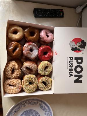 Состав бокса: 12 напудренных пончиков, 6 глазированных и 6 глазированных с посыпкой