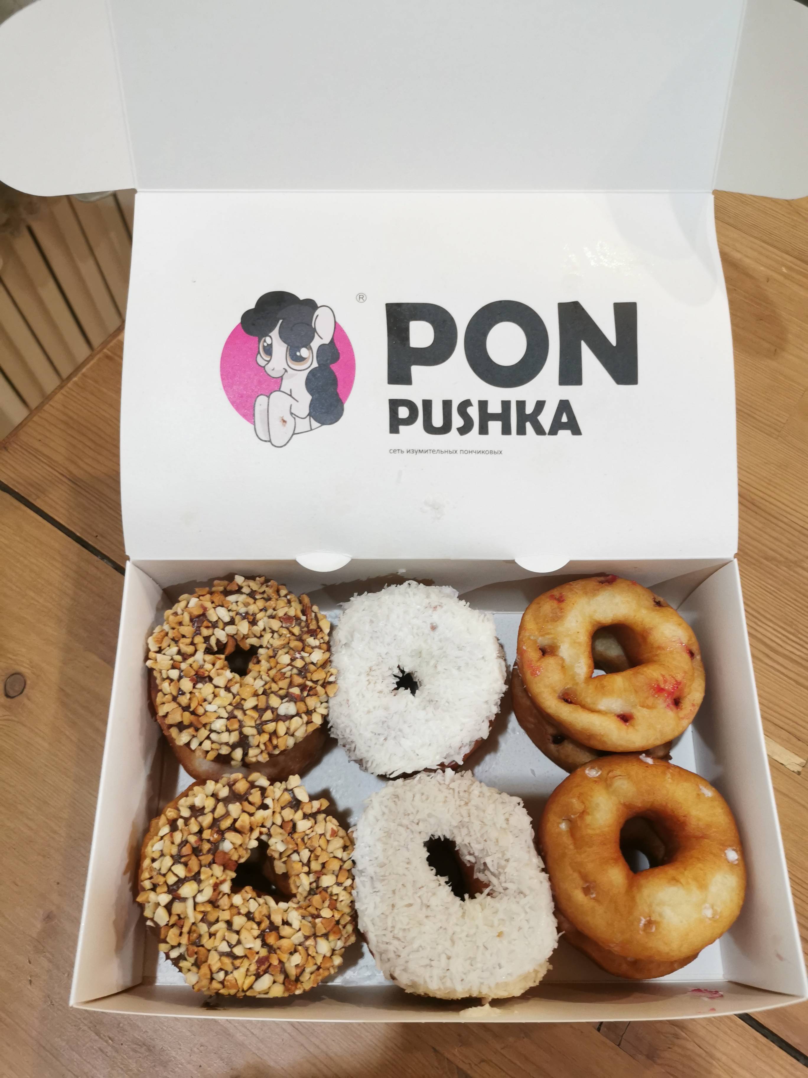 *Вкусы глазури и посыпки на пончиках в боксе выбираются случайным образом исходя из наличия в момент формирования заказа.