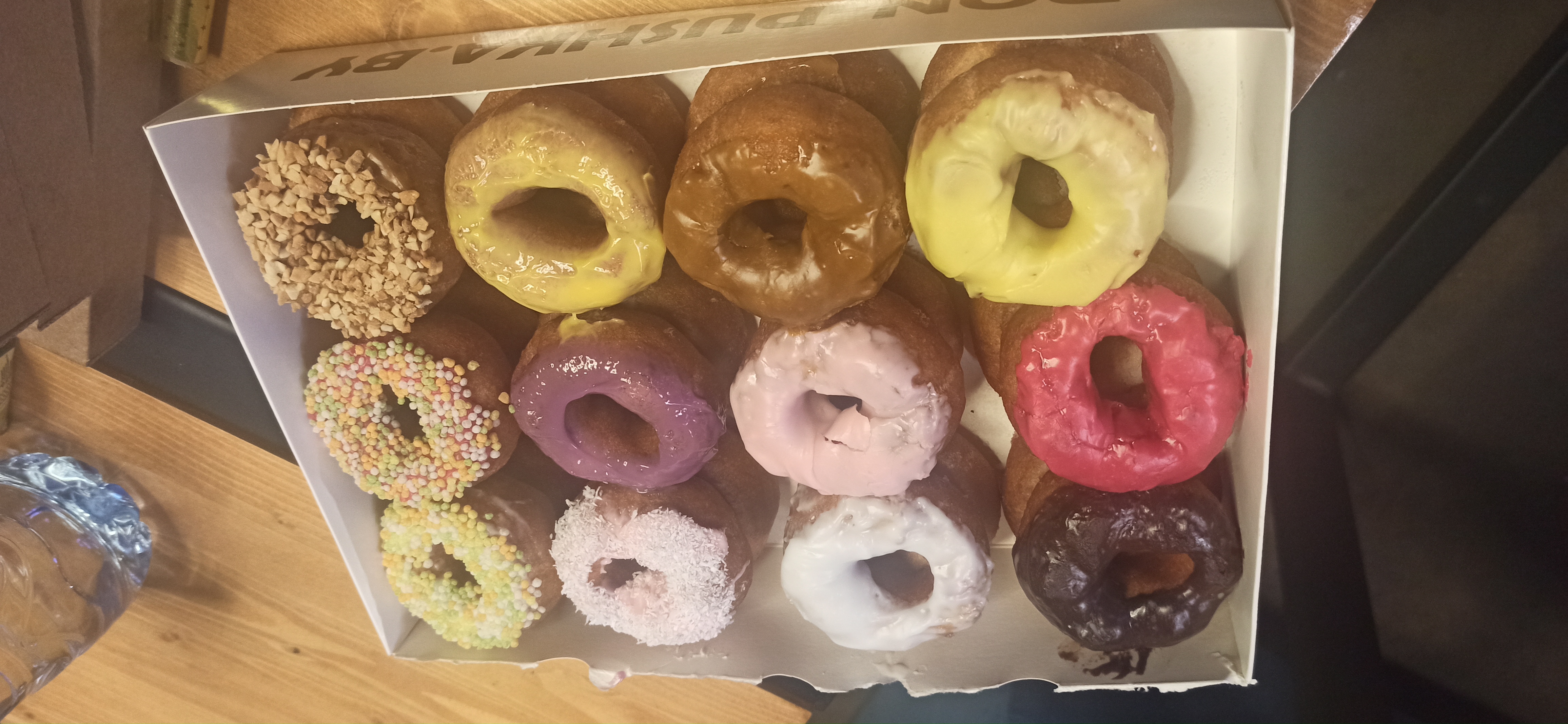 Состав бокса: 12 напудренных пончиков, 6 глазированных и 6 глазированных с посыпкой