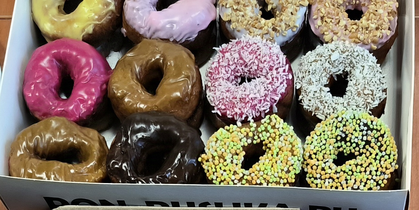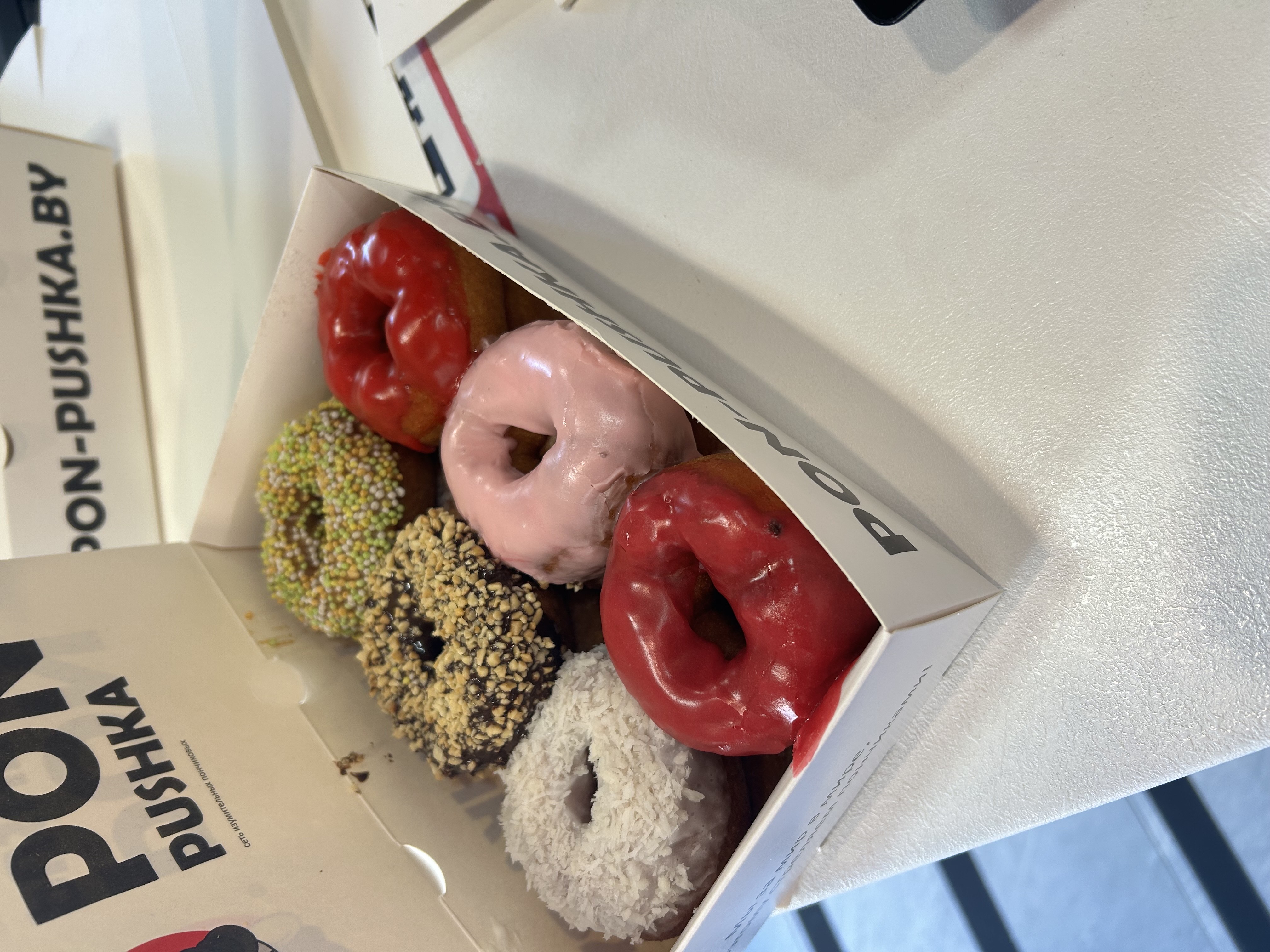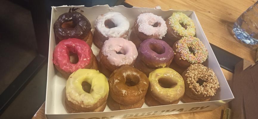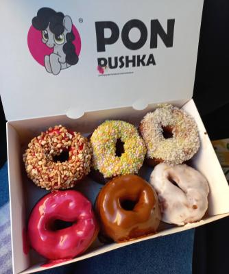 *Вкусы глазури и посыпки на пончиках в боксе выбираются случайным образом исходя из наличия в момент формирования заказа.