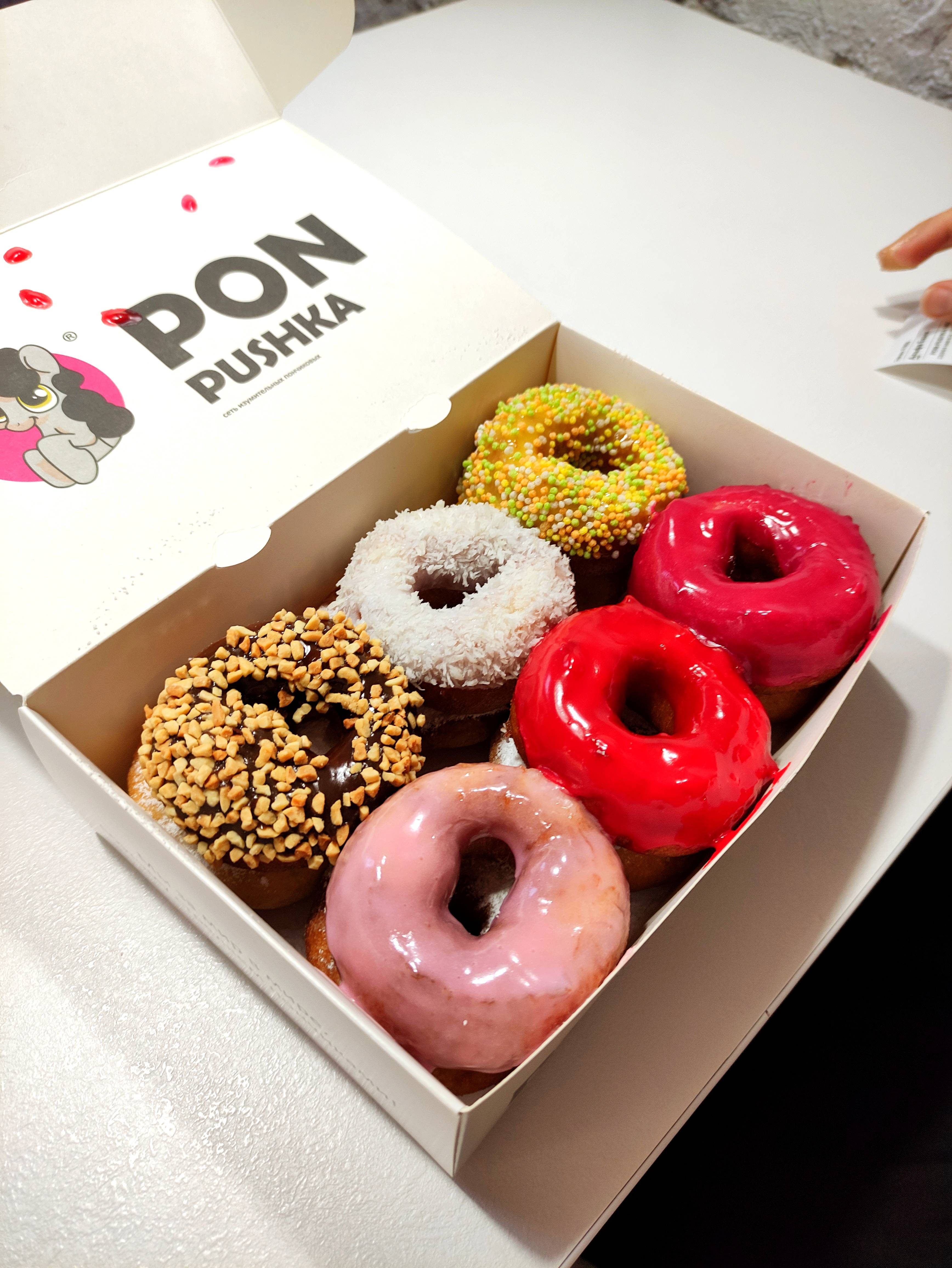 *Вкусы глазури и посыпки на пончиках в боксе выбираются случайным образом исходя из наличия в момент формирования заказа.