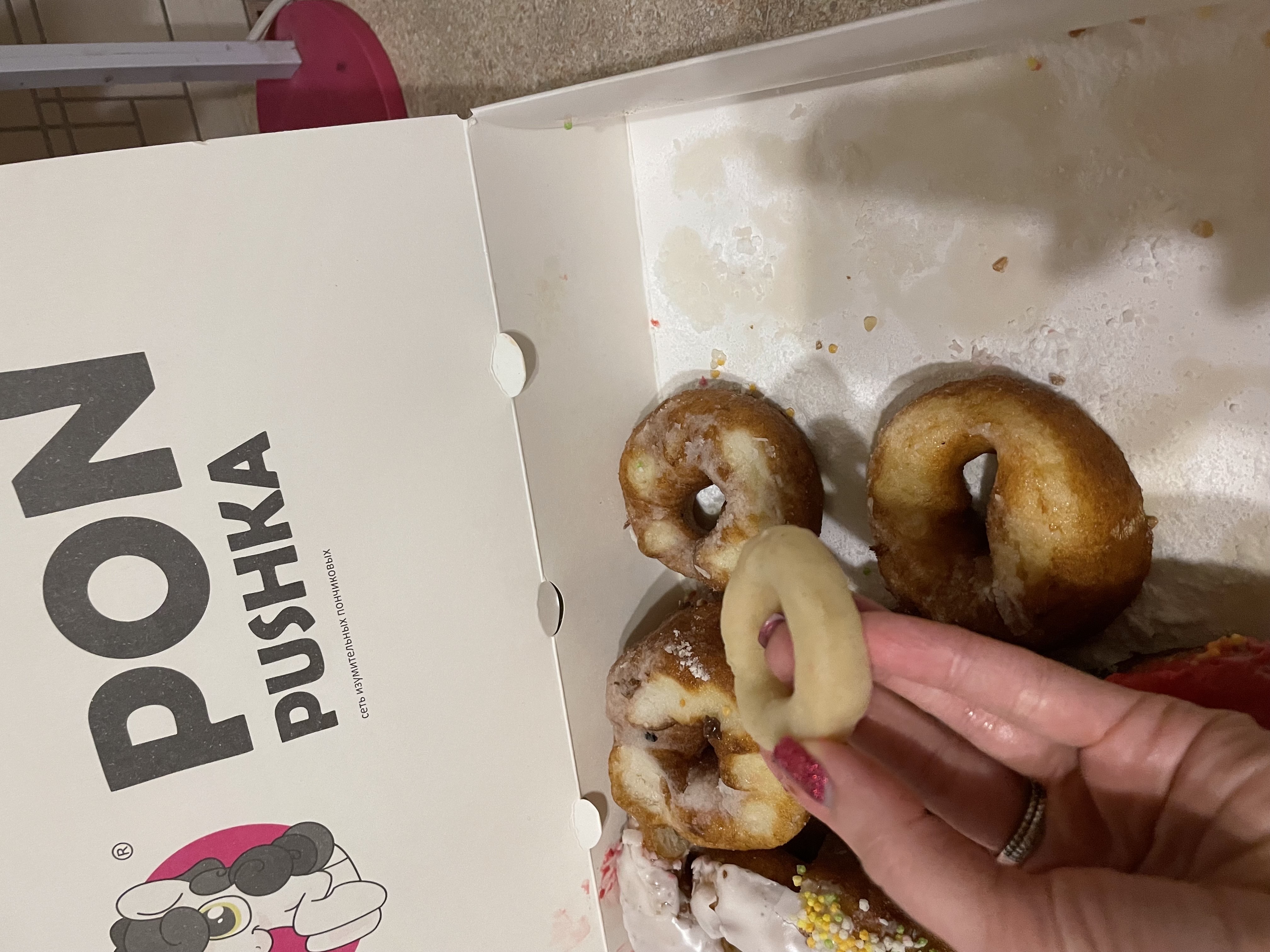 Забирала на Беды. Вкусные, но много не пропеченых, в одном так вообще сырое тесто, сын ел, откусил и говорит: у меня с начинкой🤨 из сырого теста с пончиков сложил пончик( 6 шт глазированных бвли прям в холодильника, а те что тёплые сырые