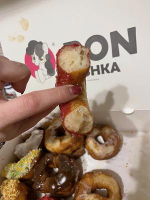 Скажу так: когда покупали на месте они тёплые, мягкие, воздушные. Взяла по сливками, приехала, коробка уже была готова, не знаю сколько она меня ждала.....но пончики были холодными, да ладно, они оказались резиновыми.....