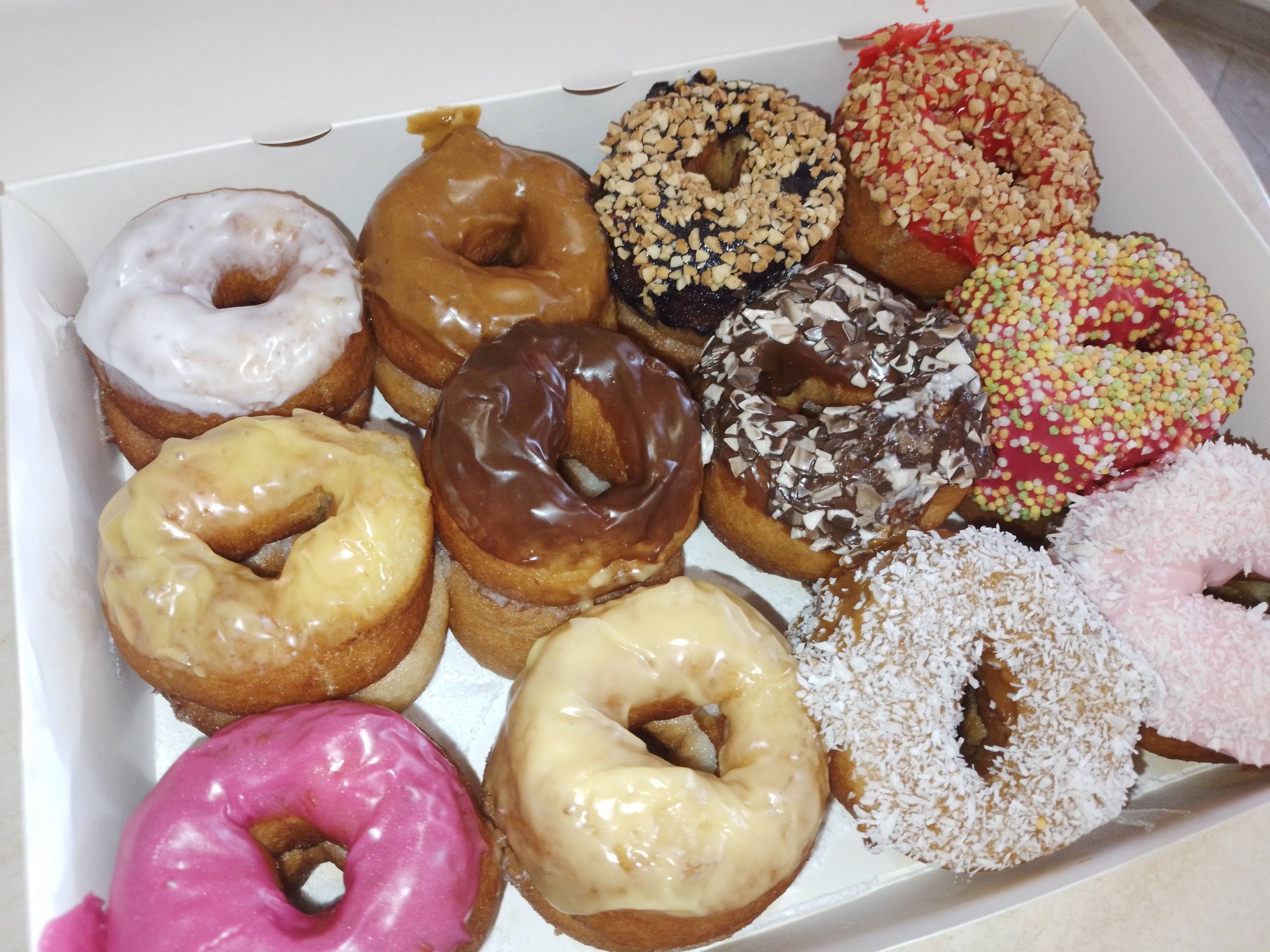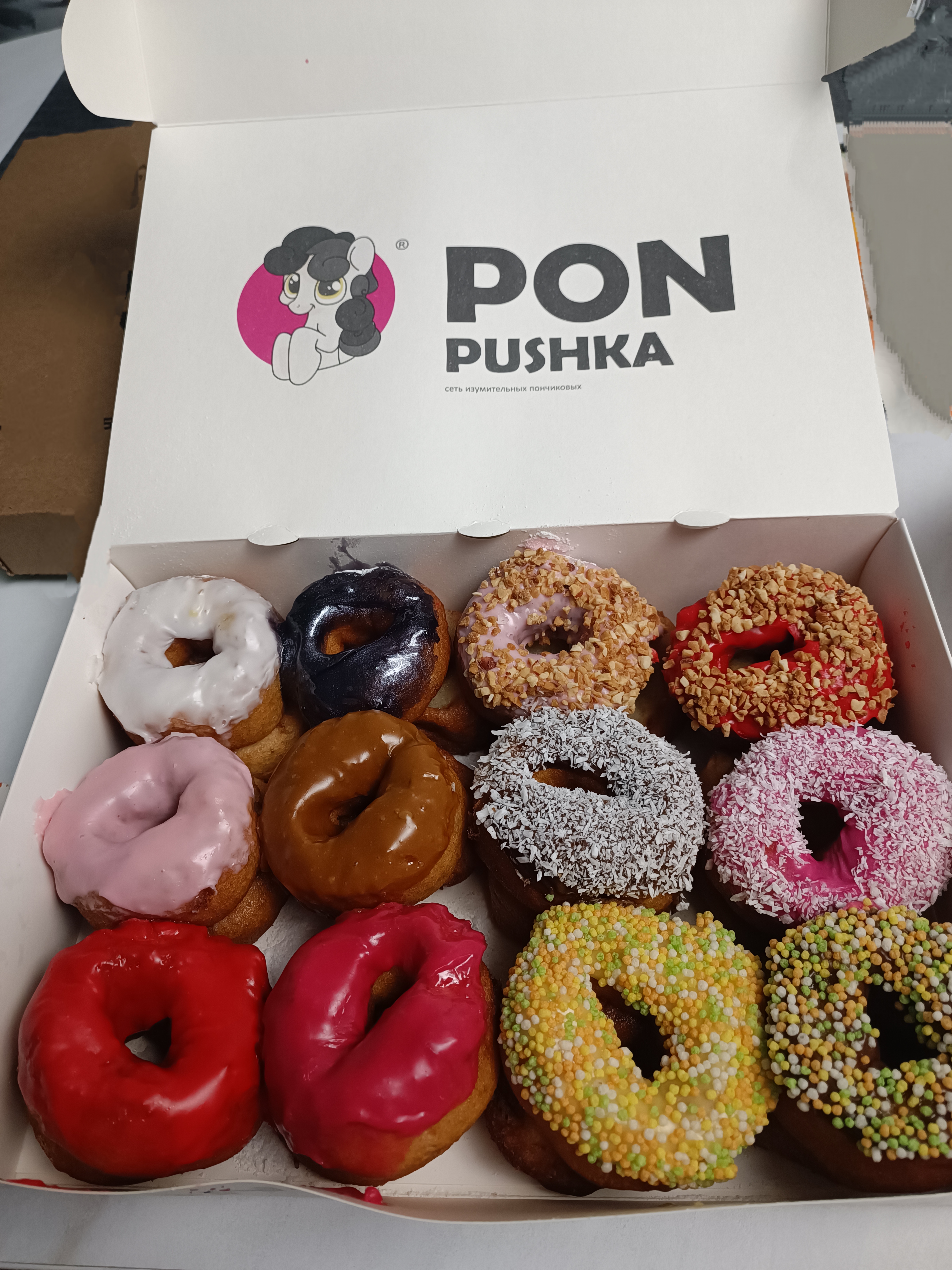 Состав бокса: 12 напудренных пончиков, 6 глазированных и 6 глазированных с посыпкой