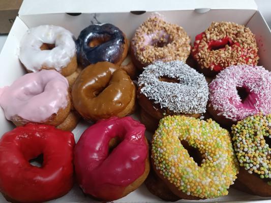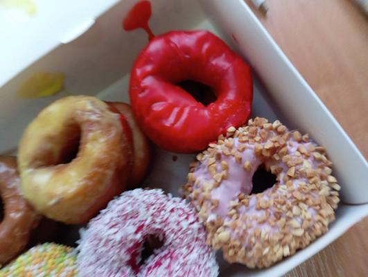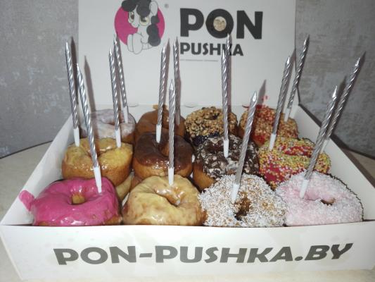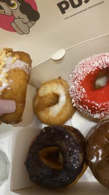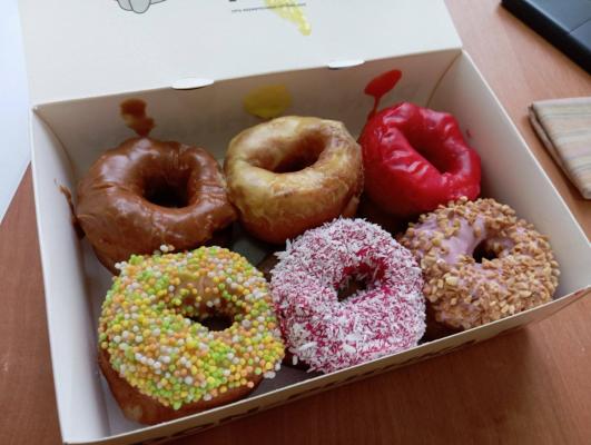*Вкусы глазури и посыпки на пончиках в боксе выбираются случайным образом исходя из наличия в момент формирования заказа.
