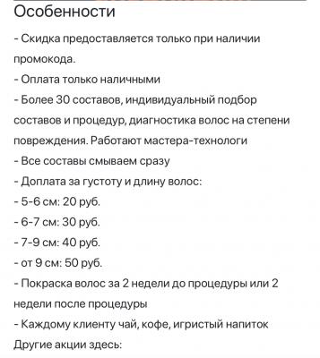 - Промокод дает право на скидку до 50% на полировку, подравнивание кончиков, выпрямление, ботокс, нанопластику волос в beauty studio "Takhmina Kolos"