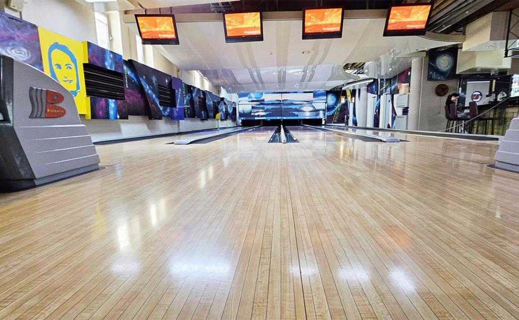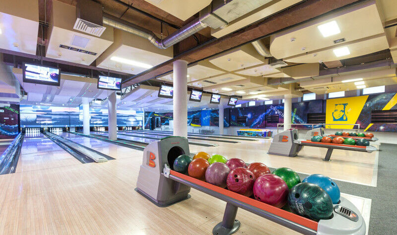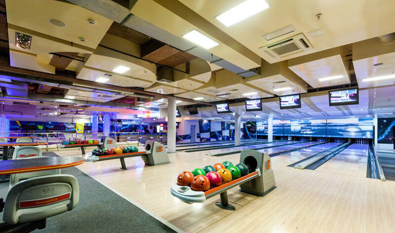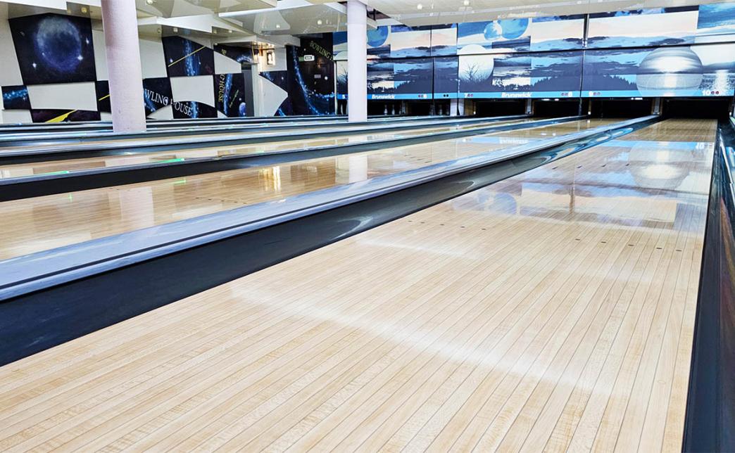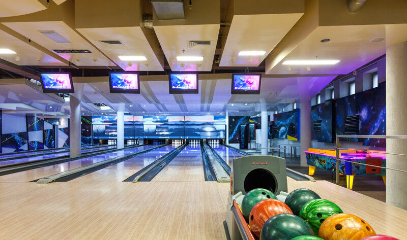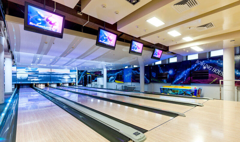 "Bowling Haus" - это 10 дорожек оборудования для боулинга компании "Brunswick", четыре из которых оснащены автоматически поднимающимися бортиками для детей, не позволяющими шару, брошенному ребенком, скатываться в желоб.