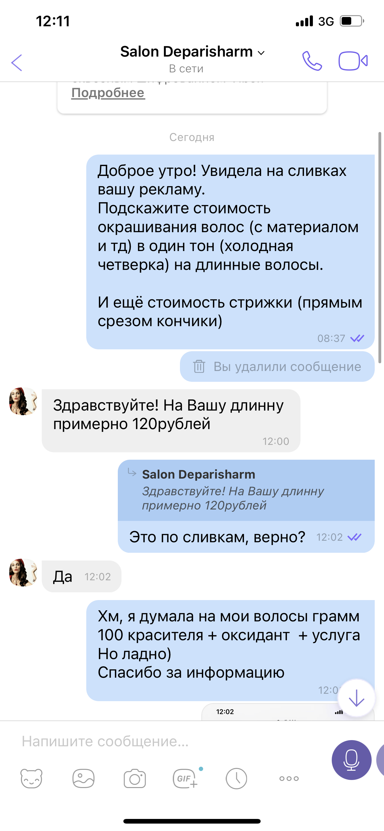 В салоне "Де Пари Шарм" приятная атмосфера, всегда вкусный чай кофе, душевный прием и опытные профессионалы парикмахеры. Они не просто окрашивают - они придают образ, при этом заботятся о здоровье Ваших волос.